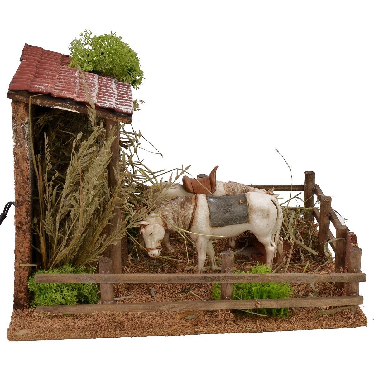 Picadero con cerca de madera y establo, en el centro de la escena dos caballos de la serie Landi que mueven la cabeza, a los que se pueden combinar estatuas de altura 10 cm. La ambientación está bien acabada en los detalles y está enriquecida con vegetación como líquenes, plantas y heno. El artículo funciona con corriente.