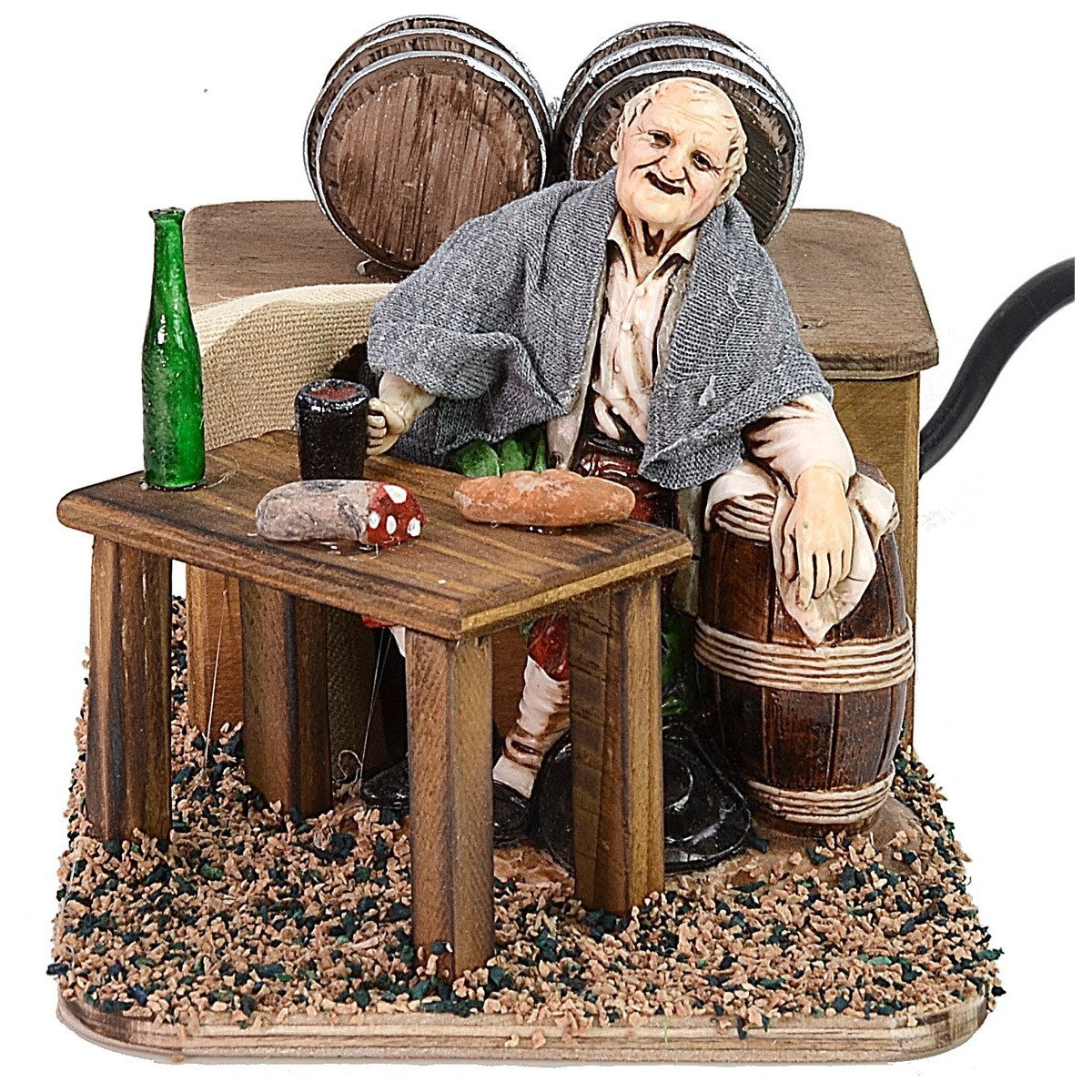 Antigua serie Landi de 12 cm sentado en la taberna en movimiento que sube y baja el brazo con el que sostiene la jarra de vino. La escenografía está bien terminada con detalles como pan, salami, una botella verde en la mesa y dos barriles de madera. El artículo funciona con corriente.