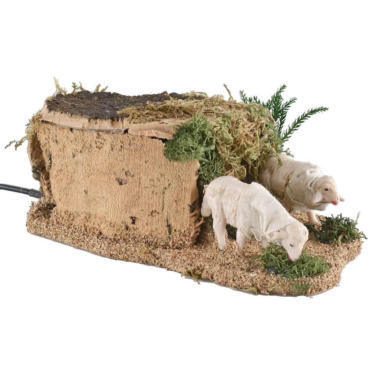 Dos ovejas en movimiento que suben y bajan la cabeza para pastar; la escena está bien acabada en los más mínimos detalles con arbustos, musgo y corcho que cubren la parte motora que funciona con corriente. Para este escenario de belén se recomiendan estatuas de altura de 10 cm. El producto ha sido realizado íntegramente en Italia por manos artesanas expertas utilizando madera, corcho y musgo.