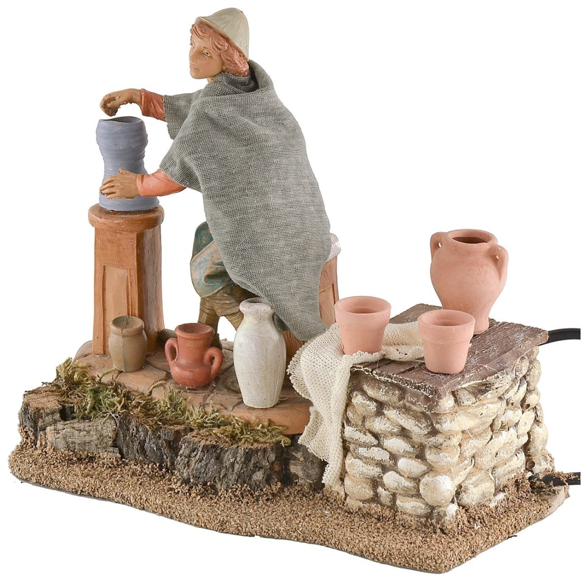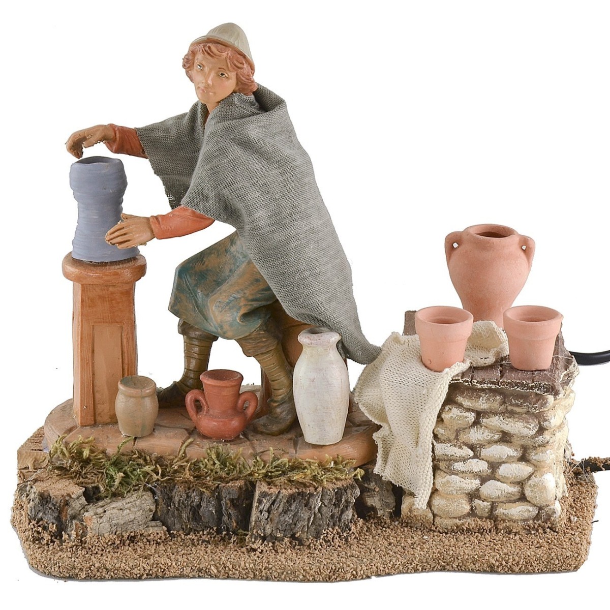Escena con doble movimiento: un ceramista mueve el brazo simulando la elaboración del jarrón de arcilla que, a su vez, gira y es modelado. La estatua forma parte de la serie Fontanini de 19 cm y está acabada con un manto de tela. La ambientación para el belén se enriquece con vajilla y jarras de terracota, además de una estructura de resina que cubre la parte del motor que funciona con corriente.