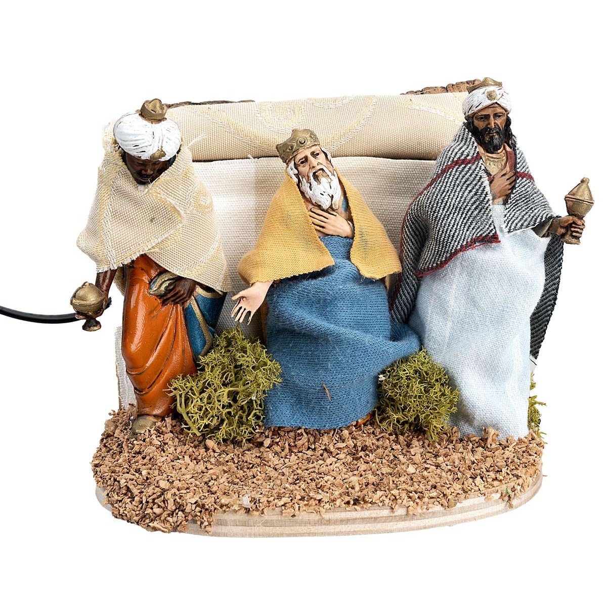 Tres Reyes Magos serie Landi Moranduzzo 10 cm en movimiento, con dos Reyes que se inclinan y uno que gira el torso llevando los regalos. La escena está realizada artesanalmente con revestimiento en tela y detalles acabados a mano.