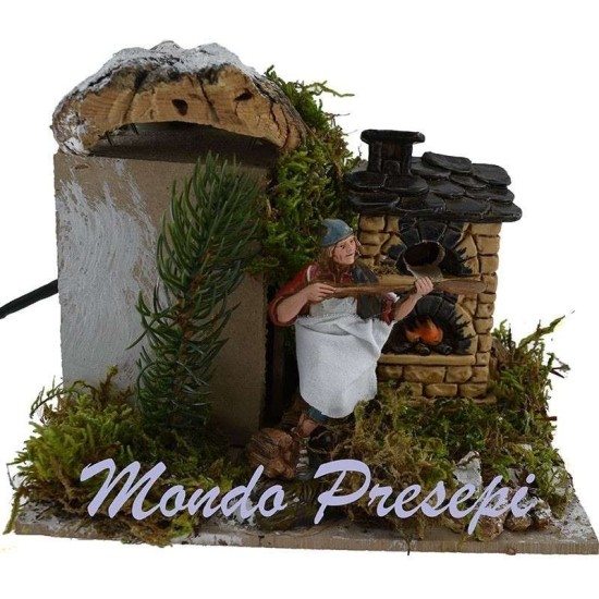 La escena representa al panadero junto al horno de piedra mientras inserta el pan con la pala de madera.