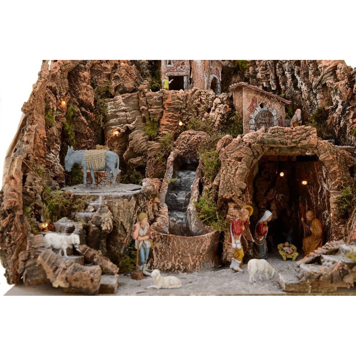Pesebre iluminado completo con estatuas Landi Moranduzzo serie de 6-8 cm, con cascada completa con bomba y burro con molino giratorio que funcionan con corriente.