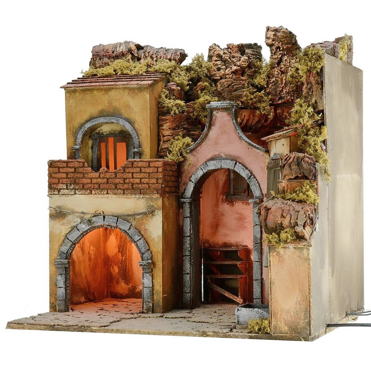 Pesebre artesanal iluminado con estilo clásico napolitano, caracterizado por una fuente que funciona con corriente, completa con una bomba de reciclaje de agua continuo. La escenografía está bien acabada en los detalles: en el piso inferior hay un amplio espacio delimitado por una entrada en arco, dentro del cual se pueden colocar estatuas de Natividad de altura recomendada 10-12 h cm según gustos y preferencias personales, algunas de las cuales se pueden ver en los productos relacionados. Además, siempre en el piso inferior, cerca de la fuente, hay una puerta de entrada de madera de una vivienda y un imponente arco que permite el acceso a un patio. Aquí, se puede encontrar un mueble expositor, ideal para montar un puesto de mercado. En toda la zona inferior se pueden colocar estatuas a gusto personal de la misma dimensión. En el piso superior, donde hay un balcón, se pueden colocar estatuas de altura 10 h cm. Las luces, que funcionan con corriente, iluminan el paisaje y crean una atmósfera sugerente. Además, el uso de musgo y corteza hace que el paisaje sea muy realista, ya que está lleno de vegetación verde y paredes rocosas circundantes. Producto realizado enteramente por manos artesanas expertas. Artículo realizado enteramente en Italia por manos artesanas expertas, utilizando corcho, madera y musgo.