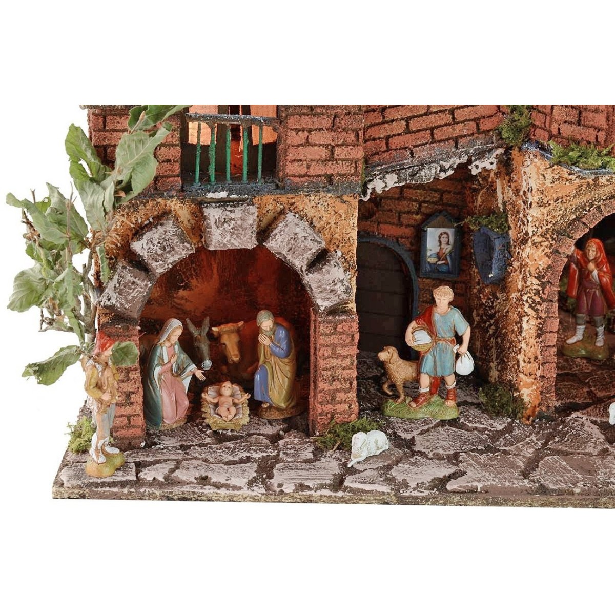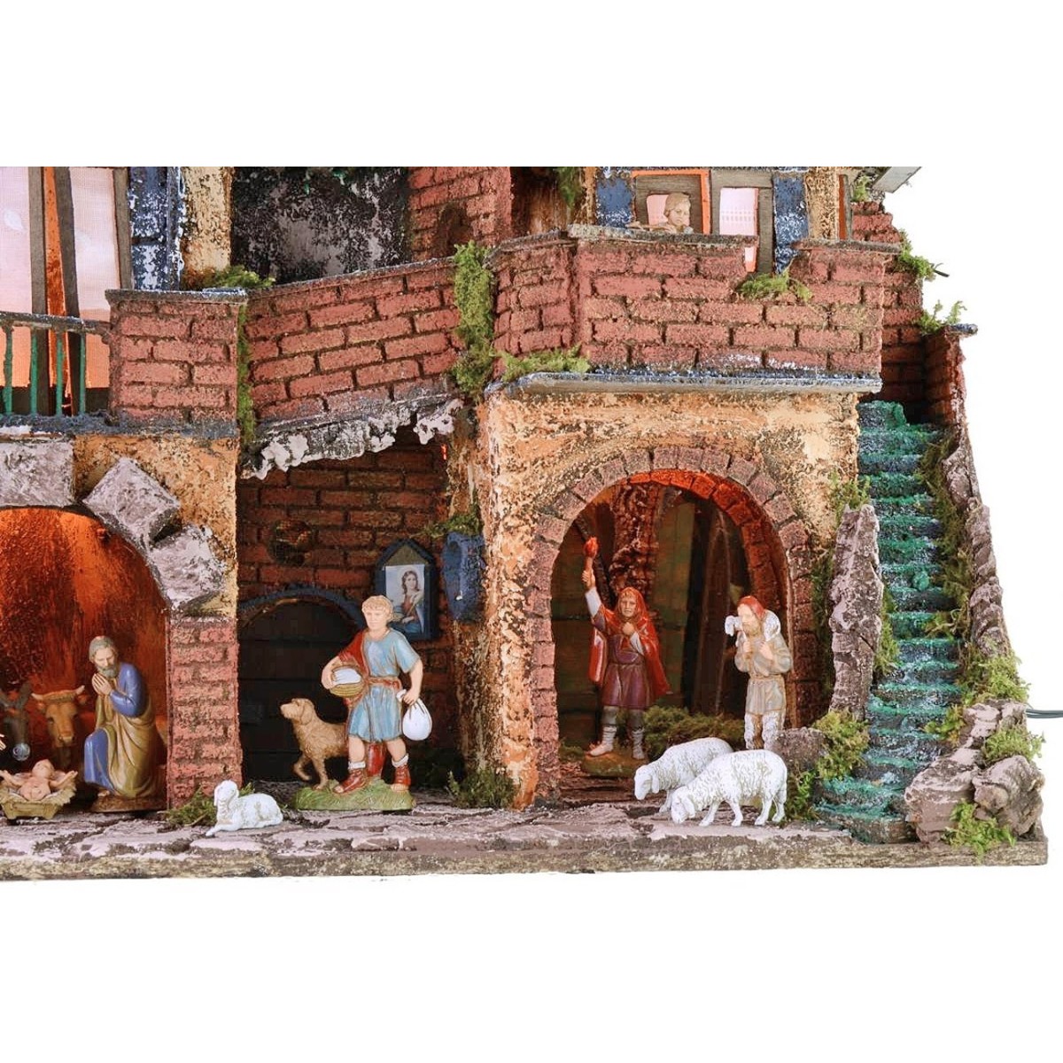 Pesebre artesanal iluminado completo con estatuas Landi Moranduzzo de estilo clásico-napolitano, caracterizado por un espejo que proporciona un importante efecto de profundidad. La escenografía está bien acabada en los detalles: en el piso inferior hay un espacio delimitado por un arco dentro del cual se colocan estatuas de la Natividad de una altura de 10 h cm. Además, también en el piso inferior, hay una puerta de entrada central con un icono colgado en la pared y una entrada en arco hacia el patio, cuyo interior se puede ver gracias a un espejo que también proporciona un importante efecto de profundidad. Dentro se puede ver un pozo, árboles y un balcón. En toda la zona inferior se pueden colocar estatuas a gusto con una altura recomendada de 10 h cm. Subiendo una escalera que conduce al piso superior, encontramos dos viviendas bien acabadas con balcones; mientras que en el último piso, un balcón adicional completa el Pesebre. Las luces, que funcionan con electricidad, iluminan el paisaje y crean una atmósfera sugestiva. Además, el uso del musgo y la corteza hace que el paisaje sea muy realista, ya que está lleno de vegetación verde y paredes rocosas circundantes. Producto realizado enteramente por manos artesanas expertas. Artículo realizado completamente en Italia por manos artesanas expertas, utilizando corcho, madera y musgo. Recordamos que la serie Landi Moranduzzo de 10 cm tiene una altura real de aproximadamente 9 cm. También se precisa que el número de estatuillas siempre será el mismo que en la foto, pero los sujetos podrían ser reemplazados por otros de la serie Landi Moranduzzo según disponibilidad.