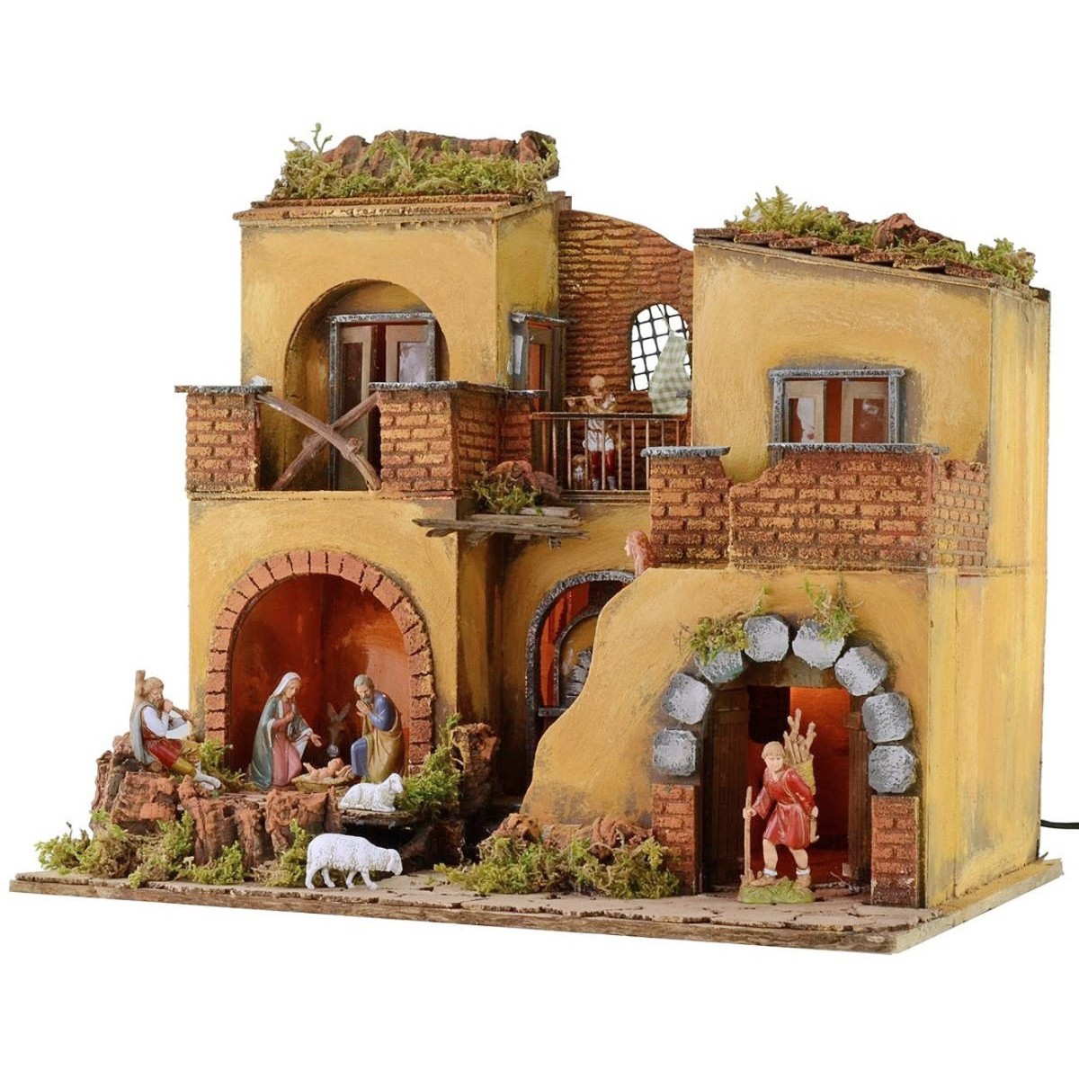 Pesebre artesanal iluminado en estilo clásico napolitano, completo con estatuas de la serie Landi Moranduzzo de 10 cm, con horno y leña efecto fuego funcionando a corriente.