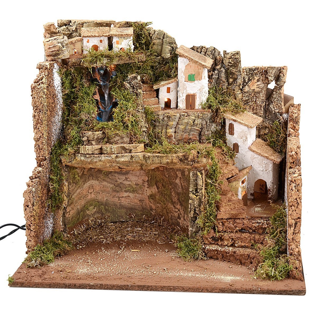 Pesebre artesanal iluminado con cascada funcional de estilo clásico completo con estatuas Landi Moranduzzo. El piso superior se caracteriza por una cascada de dos niveles que crea un hermoso juego de agua y pequeñas casitas blancas. Las escaleras conducen al piso inferior donde se encuentra una gran cueva en la que se puede colocar la Natividad Landi Moranduzzo de 10 cm de altura. La escenografía está bien definida en los detalles, la iluminación enfatiza la atmósfera y la cascada captura la atención gracias al movimiento del agua generado por una bomba de reciclaje que funciona con corriente. El artículo ha sido realizado completamente en Italia, utilizando madera, musgo y corcho.