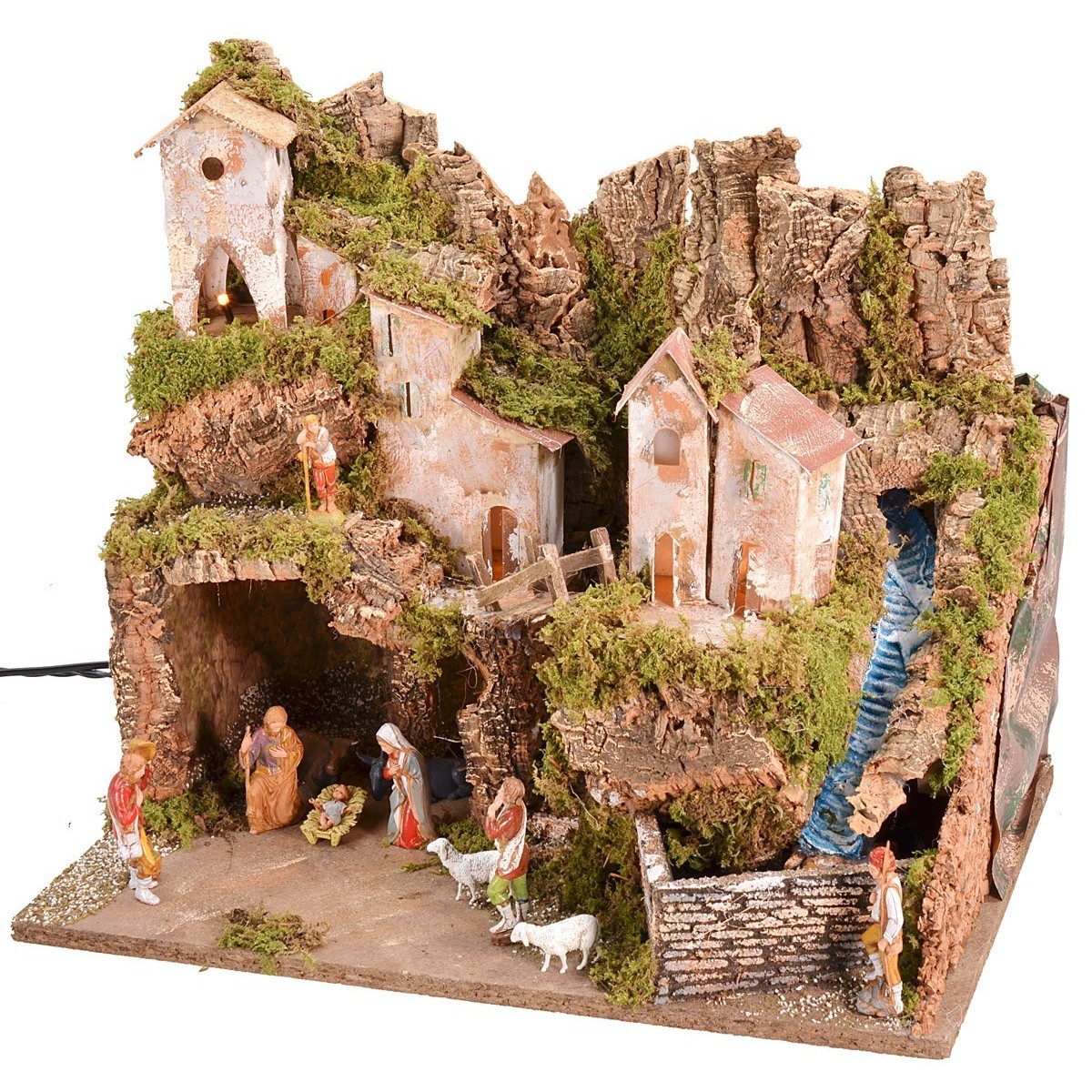 Pesebre completo de estatuas Landi Moranduzzo, luces y cascada funcionando a corriente y completo con bomba. La escenografía está bien acabada en los detalles: A la izquierda hay una cueva donde se coloca la Natividadà cm 8 serie Landi Moranduzzo. A la derecha, en cambio, hay un arroyo en funcionamiento que se desarrolla en las alturas y desciende en cascada hacia abajo, donde hay una piscina delineada por un muro con efecto de ladrillos. En el centro de la escenografía, hay unas escaleras que conducen a las viviendas superiores, unidas de un extremo al otro gracias también a la presencia de un puente. Un elemento característico es la verde y densa vegetación circundante que hace el paisaje muy realista. En el Pesebre se incluyen las estatuas presentes en la foto. La iluminación que funciona a corriente hace que el paisaje sea sugestivo. Artículo realizado enteramente en Italia por hábiles manos artesanas, utilizando madera, corcho y musgo. Se recuerda que la serie Landi Moranduzzo de 10 cm tiene una altura real de aproximadamente 8,5 cm. Se precisa, además, que el número de las estatuillas siempre permanecerá invariable respecto a la foto, pero los sujetos podrían ser sustituidos por otros de la misma serie Landi Moranduzzo según las disponibilidades.