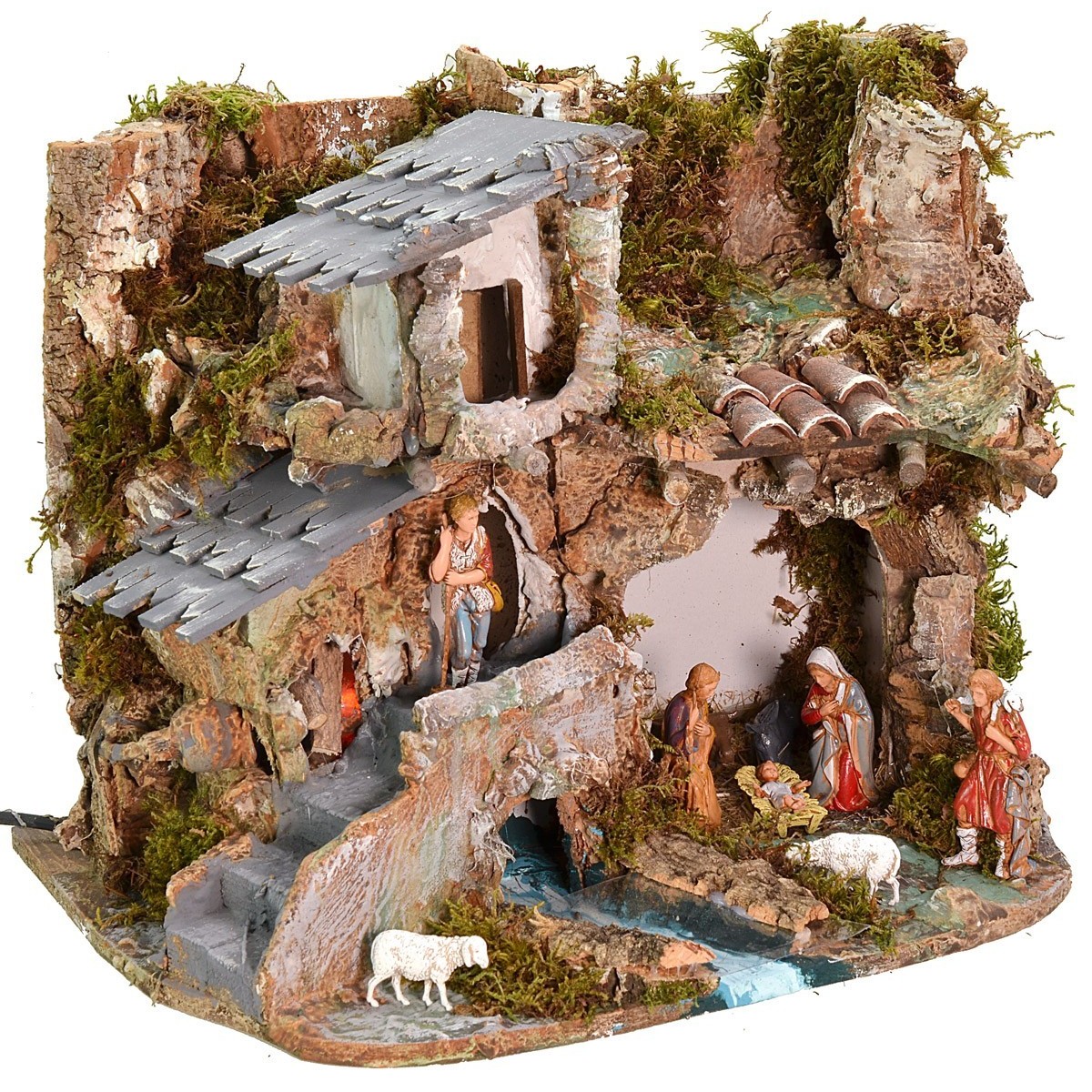 Pesebre artesanal completo con estatuas serie Landi Moranduzzo de 8 cm, compuesto por la cueva, casa y luz funcional a corriente con efecto fuego. La escenografía está bien acabada en los detalles: el uso del musgo y la corteza hace que el paisaje sea muy realista, ya que está lleno de vegetación verde y paredes rocosas circundantes. A la derecha, hay una cueva con paja, donde se encuentra la Natividad serie Landi Moranduzzo de 8 cm. El techo sobre la cueva está acabado con tejas de terracota. A la izquierda, hay una vivienda estucada de dos pisos con un fuego funcional al lado, donde se pueden colocar estatuas de una altura recomendada de 6-6,5 cm, jugando así con la perspectiva. Cerca de la casa hay un río pintado a mano con efecto de profundidad. Artículo realizado enteramente en Italia por manos artesanas expertas, utilizando madera, corcho y musgo. Se recuerda que la serie Landi Moranduzzo de 8 cm tiene una altura real de aproximadamente 7 cm. Se precisa, además, que el número de figuritas siempre permanecerá invariable respecto a la foto, pero los sujetos podrían ser sustituidos por otros de la misma serie Landi Moranduzzo según las disponibilidades.