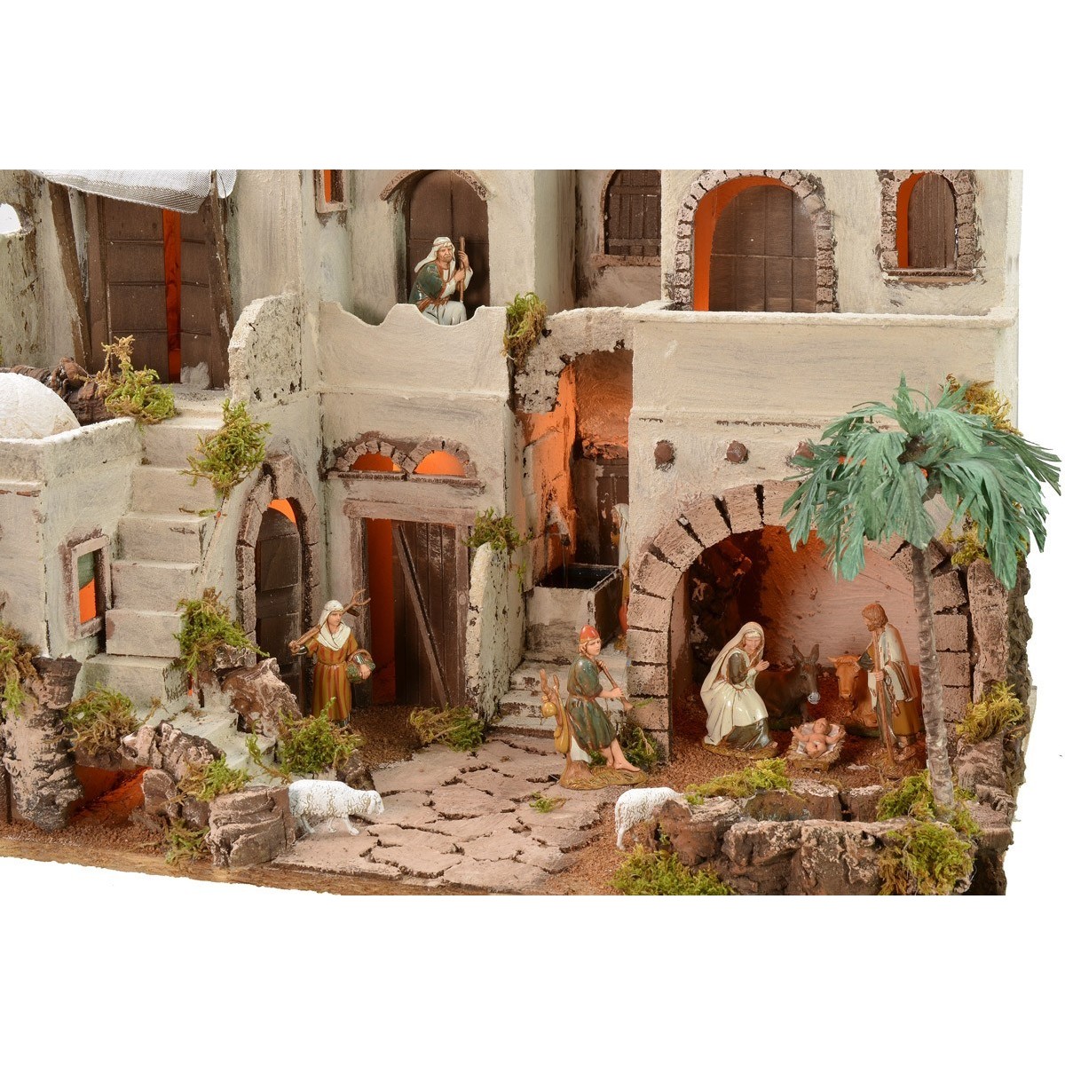 Pesebre artesanal iluminado en estilo palestino, completo con estatuas Landi Moranduzzo con trajes históricos y caracterizado por una fuente que funciona con corriente. La escenografía se compone, comenzando desde la derecha, de un pequeño oasis con una palmera detrás de la cual se encuentra la Natividad Landi Moranduzzo serie 10 cm; el cuerpo central está compuesto por un sendero con una fuente funcional, mientras que a la derecha se encuentra un grupo de viviendas. Las luces, que funcionan con corriente, iluminan el paisaje y crean una atmósfera sugestiva. Además, el uso de musgo y corteza hace que el paisaje sea muy realista, ya que está lleno de vegetación verde y paredes rocosas circundantes. Artículo realizado íntegramente en Italia por manos artesanas expertas, utilizando corcho, madera y musgo. Recordamos que la serie Landi Moranduzzo de 10 cm tiene una altura real de aproximadamente 9 cm. Además, se precisa que el número de figuritas siempre será igual a la foto, pero los sujetos podrían ser reemplazados por otros de la serie Landi Moranduzzo según las disponibilidades.