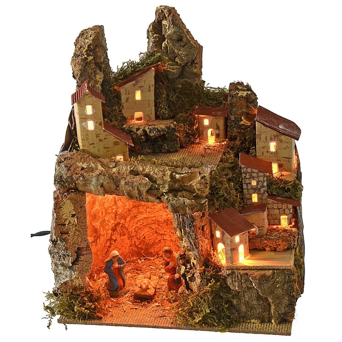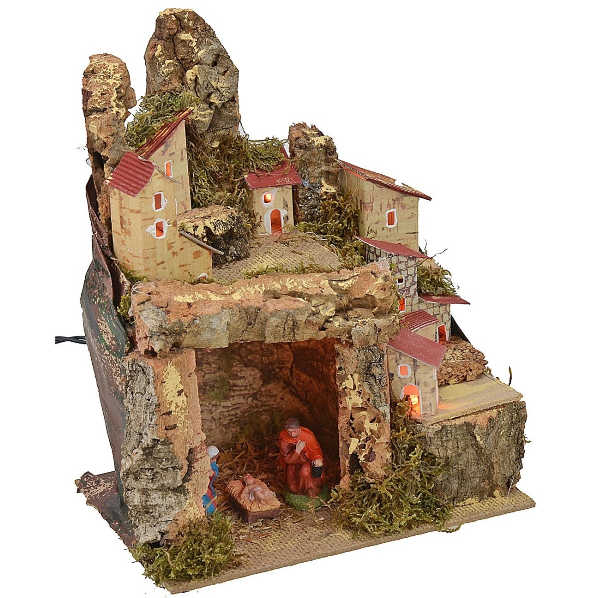 Pesebre iluminado con luces LED de color blanco cálido con paisaje en la distancia y cueva completa de Natividad en resina de la serie 6 h cm. El paisaje montañoso se caracteriza por terrazas en diferentes niveles que permiten enfatizar el efecto de perspectiva de las casitas en la distancia. En el centro, encontramos una cueva dentro de la cual se colocan estatuas de Natividad en resina de la serie 6 cm, compuesta por María, San José y el niño Jesús. El pesebre ha sido realizado artesanalmente por hábiles manos artesanas en Italia utilizando madera, corcho y musgo. Las luces presentes en la escenografía funcionan con corriente.