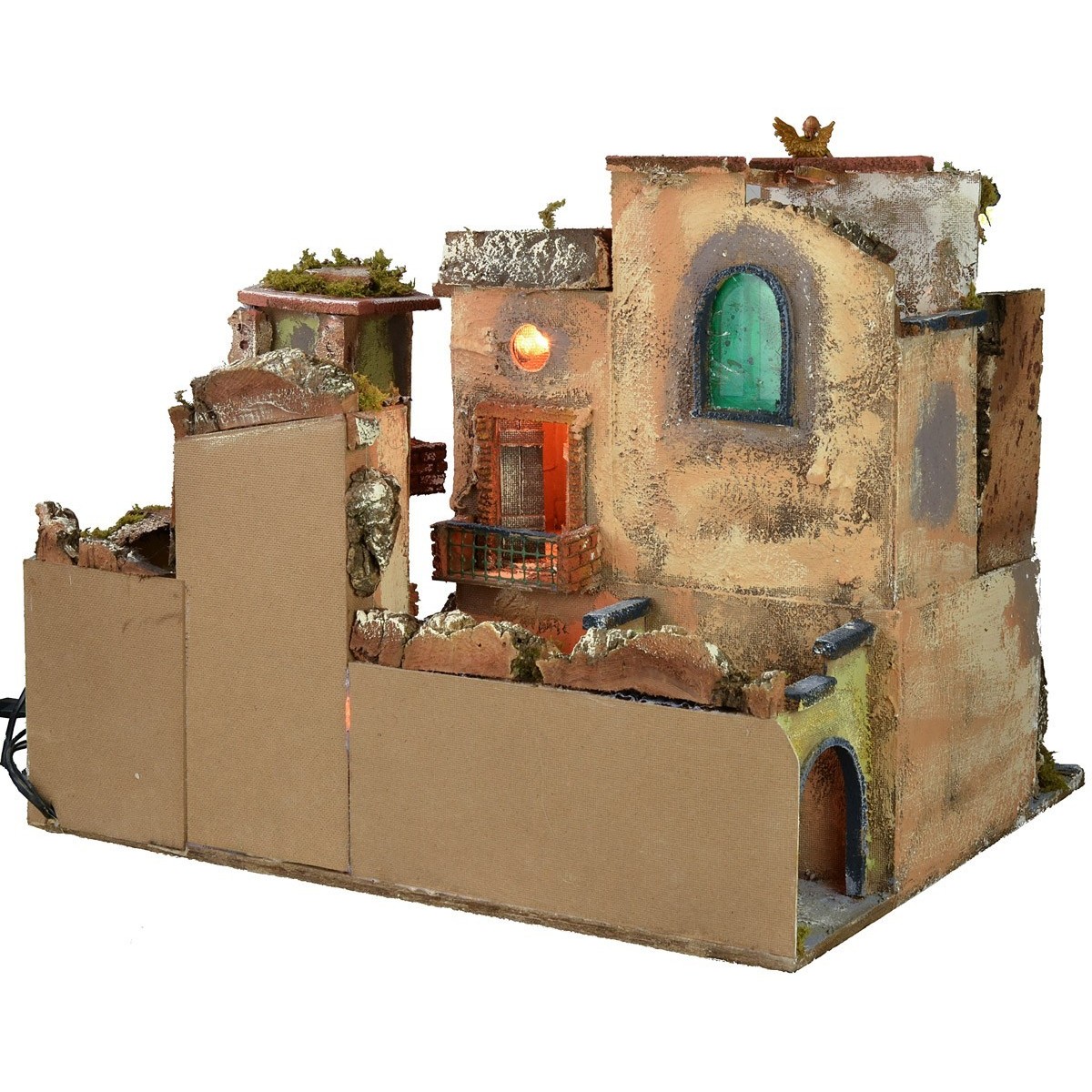 Pesebre con pueblo iluminado por luces LED de luz blanca cálida, de estilo napolitano del siglo XVIII, con horno funcional con luz efecto fuego y molino en movimiento. La escenografía está realizada en dos niveles: en el nivel inferior, encontramos una cabaña en la que se pueden colocar estatuas de altura recomendada de 10 h cm. En el centro, hay un molino de agua funcional a corriente completo con bomba de reciclaje de agua continua; mientras que a la derecha hay una vivienda dispuesta en dos niveles y un horno funcional a corriente con efecto llama. En el nivel superior, hay otra vivienda donde se puede montar una tienda o enriquecer el espacio a gusto con miniaturas y estatuas. Se especifica que en el nivel inferior, además, hay un callejón que conduce a la parte trasera del pesebre, donde la idea del pueblo toma forma gracias a las múltiples casas con balcones y escaleras. El pesebre ha sido realizado artesanalmente por hábiles manos artesanas en Italia utilizando madera, corcho y musgo. El artículo funciona a corriente y está dotado de dos enchufes.