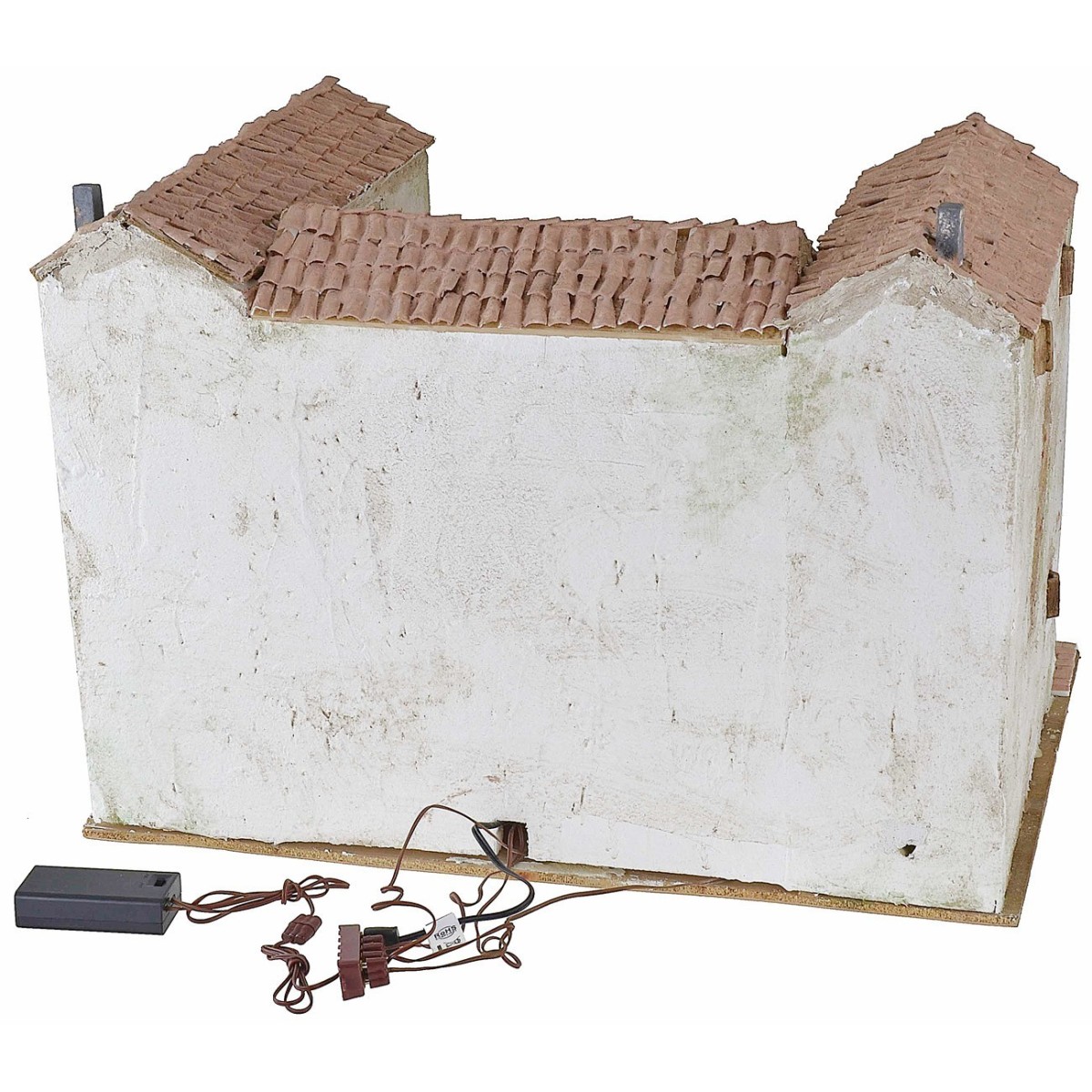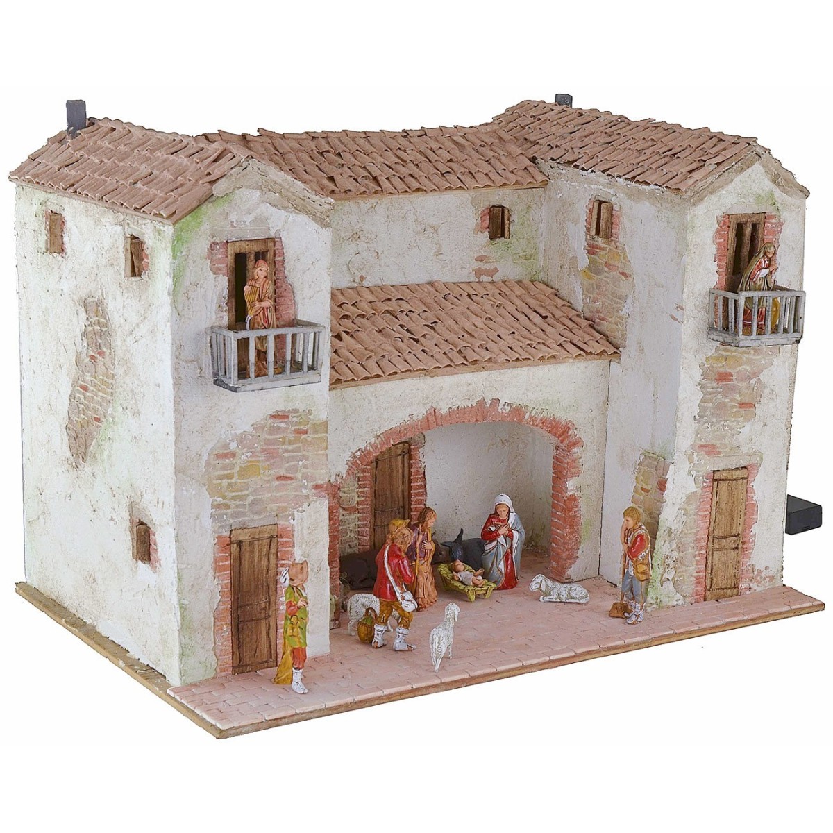 Burgo compuesto por dos unidades habitacionales con un amplio pórtico central en arco donde se coloca la Natividad. En la unidad central se coloca leña con fuego funcionando. La particularidad de esta vivienda son las paredes con estuco blanco de las que se vislumbran algunos ladrillos, y en los productos relacionados están disponibles otras piezas de la serie para poder completar el burgo en el pesebre. El producto ha sido realizado en Italia enteramente a mano con poliestireno, estuco y madera y está completo con estatuas de la serie 8. Se precisa que el artículo será entregado con el mismo número de estatuas como se muestra en la foto, pero podrían cambiar los sujetos dependiendo de las disponibilidades del momento.