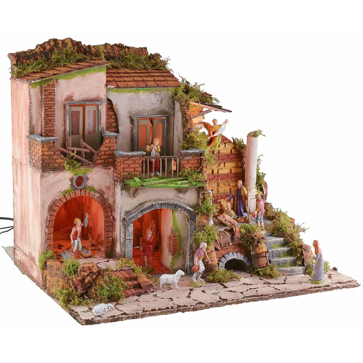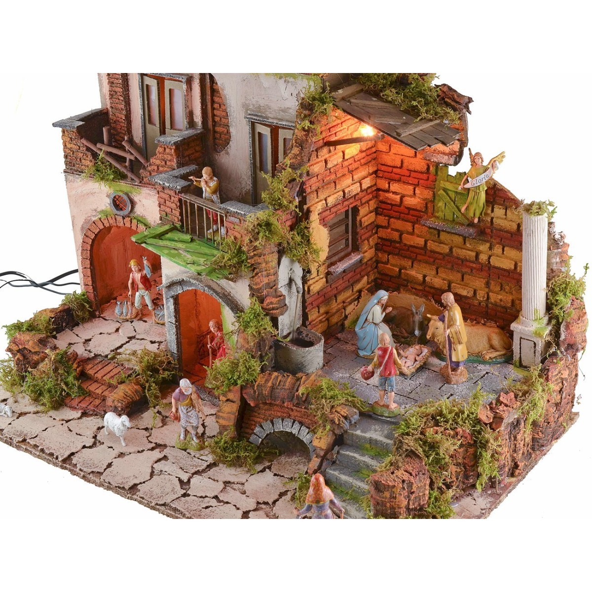 Aldea napolitana estilo '700 iluminada y equipada con fuente, completa con bomba, funcionando a corriente. La ambientación está dividida en dos pisos; en el inferior hay dos amplios pórticos donde se pueden montar tiendas, mientras que en el superior hay viviendas con balcón. El pesebre está completo con figuritas Landi Moranduzzo serie 10 cm. Se precisa que el artículo se entregará con el mismo número de figuras que se muestra en la foto, pero los sujetos pueden cambiar según la disponibilidad del momento. La altura real de las figuras Landi Moranduzzo de la serie 10 cm es de aproximadamente 9 cm. El artículo ha sido producido por artesanos napolitanos con madera, corcho y musgo.