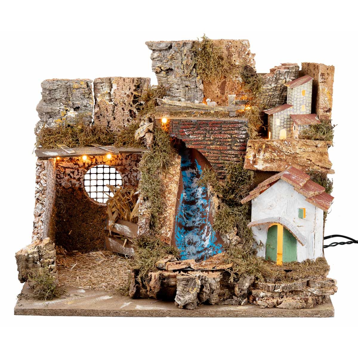 La escenografía se desarrolla en dos niveles. A la izquierda se encuentra un establo abierto con techo de madera y paredes de corteza, iluminado internamente por tres luces y dotado de una reja redonda en el fondo; dentro es posible montar la escena de la Natividad. En el centro hay una cascada funcional, incrustada entre rocas y musgo. A la derecha hay dos casas: abajo una casita con puerta de arco verde y techo de tejas rojas; arriba, dos casitas de piedra con techo inclinado, integradas en el fondo rocoso.