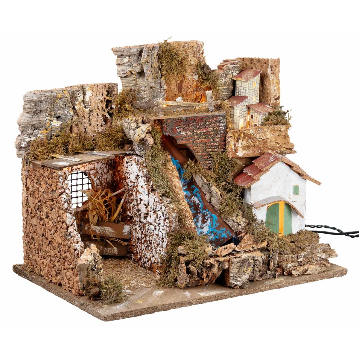 Belén artesanal iluminado con cascada completa de bomba para el reciclaje de agua funcionando a corriente. Se recomienda para figuritas de 10 cm de altura, adquiribles por separado.