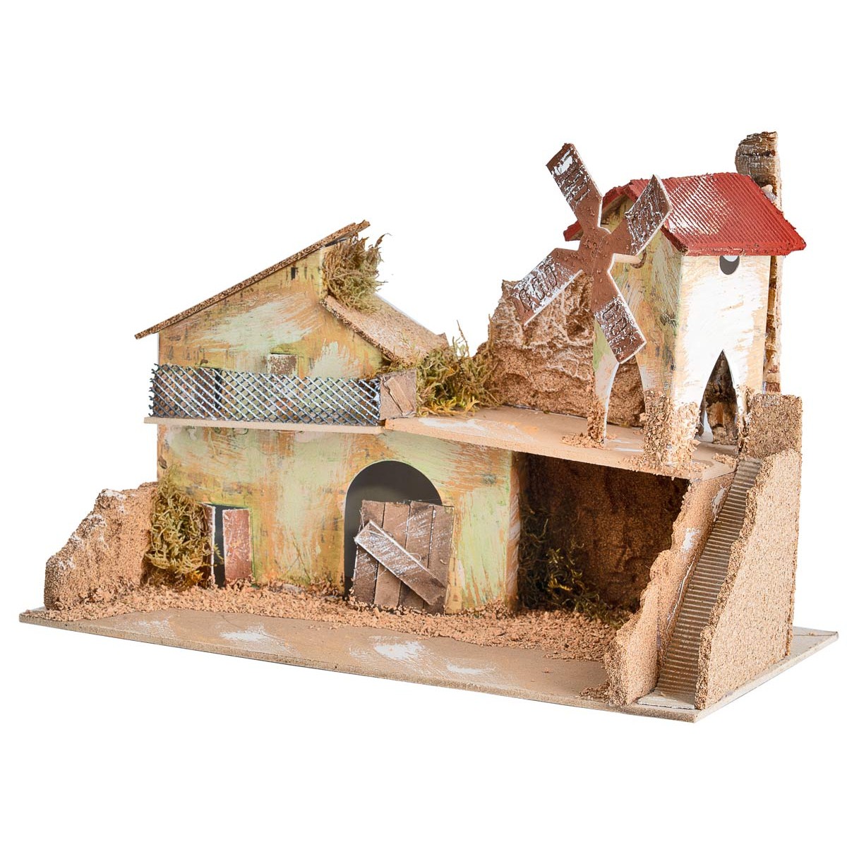 Pesebre artesanal con casa de campo y molino de viento. Se recomienda para figuras de altura de 3,5 a 6 cm, adquiribles por separado.