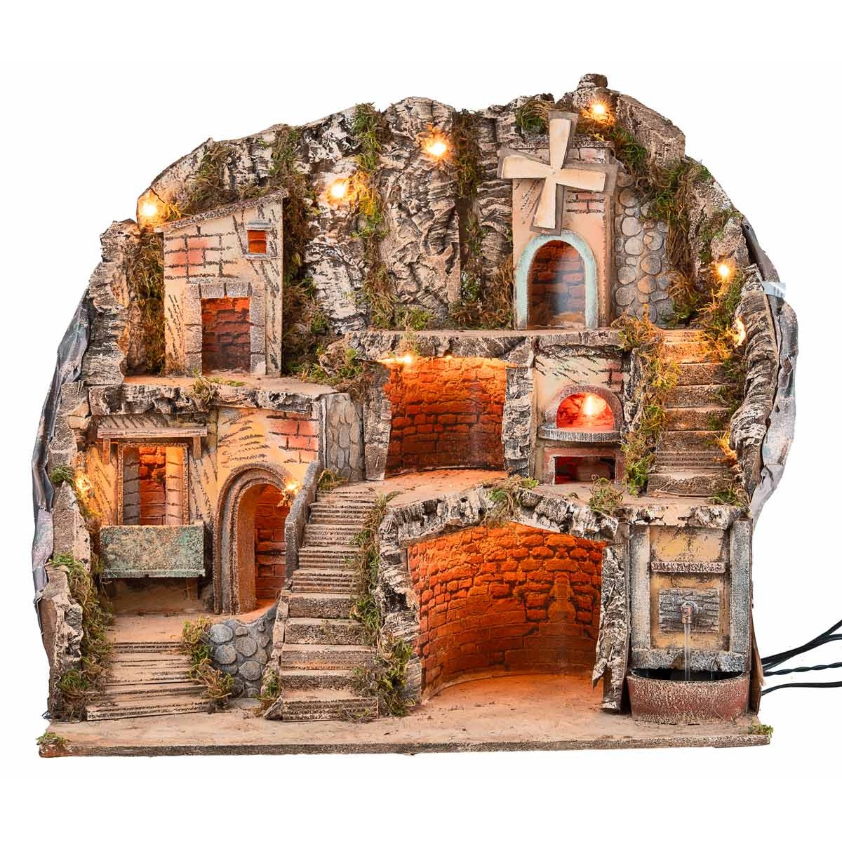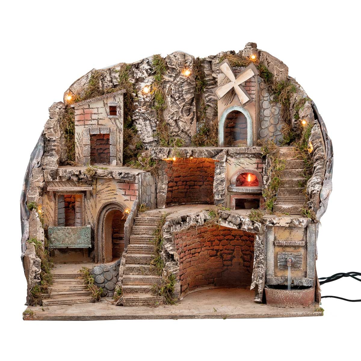 Belén artesanal iluminado con horno con luz de fuego efecto llama, fuente completa con bomba para la recirculación del agua y molino de viento eléctrico, funcionando con corriente.