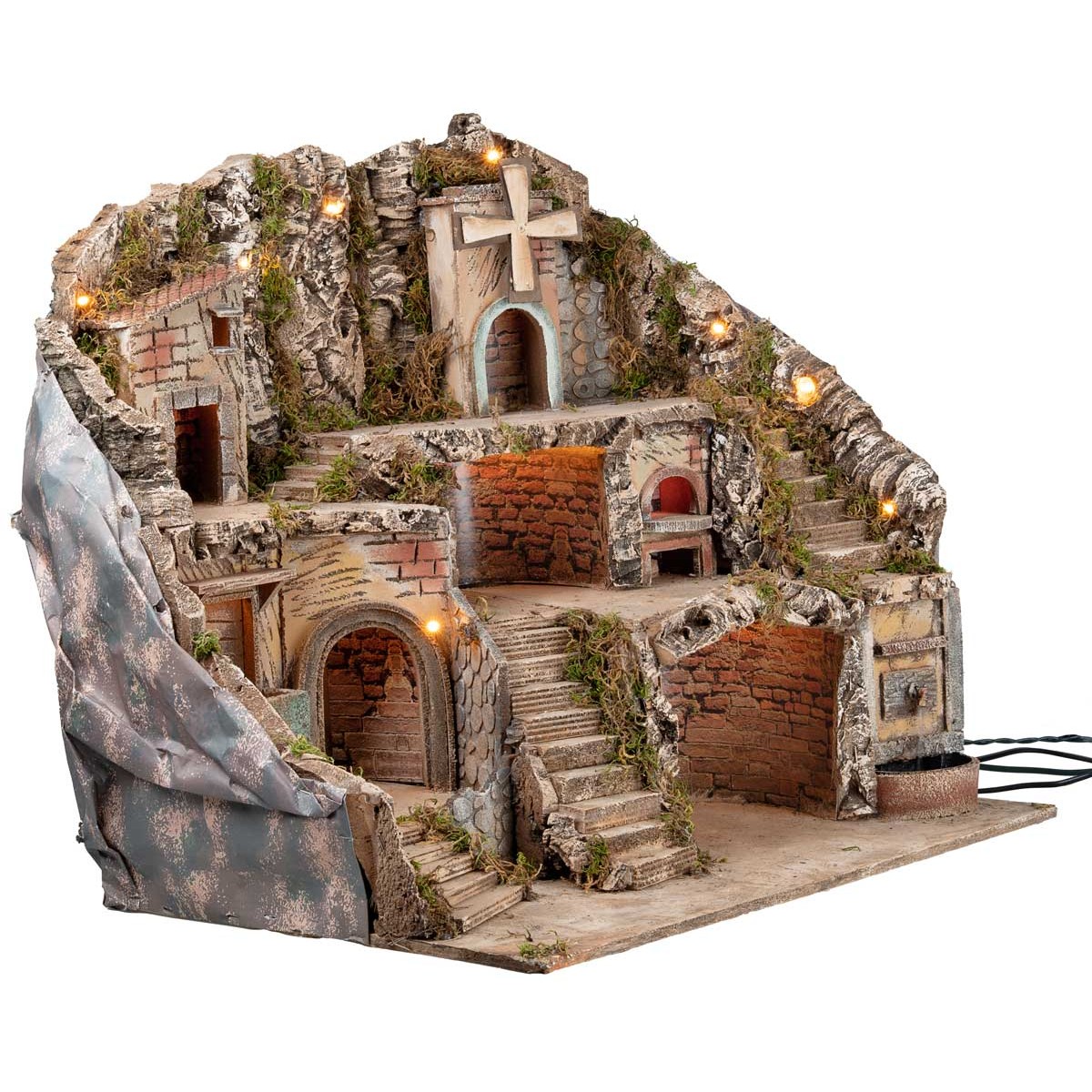 La escenografía se desarrolla en altura en tres niveles integrados en la roca, con caminos y escaleras que conectan las diferentes zonas. En la base se abre una amplia cueva con paredes de falso ladrillo, ideal para colocar la Natividad. A los lados se desarrollan escaleras que conducen a los niveles superiores, donde se encuentran viviendas rústicas con arcos y ventanas. En el segundo nivel se coloca el horno con efecto llama, mientras que en el lado derecho se encuentra una fuente con chorro de agua. En la parte alta domina el molino de viento incrustado en la roca. Toda la estructura está adornada con puntos de luz distribuidos entre las casas y los senderos, creando un sugestivo efecto nocturno.