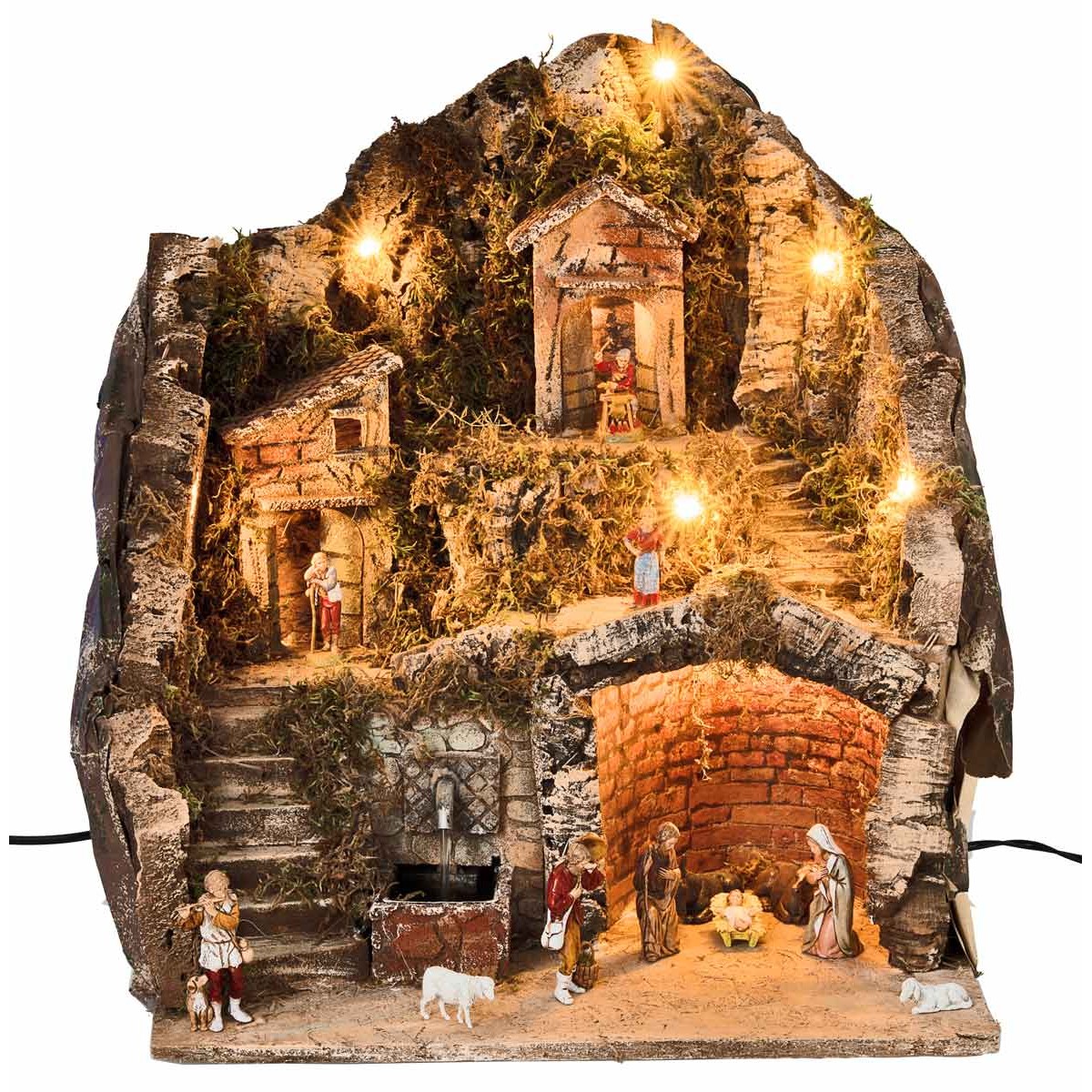 Pesebre artesanal iluminado con horno, molino de viento y fuente funcionando, alimentados por corriente, completo de estatuas de la serie Landi Moranduzzo de 10 cm.