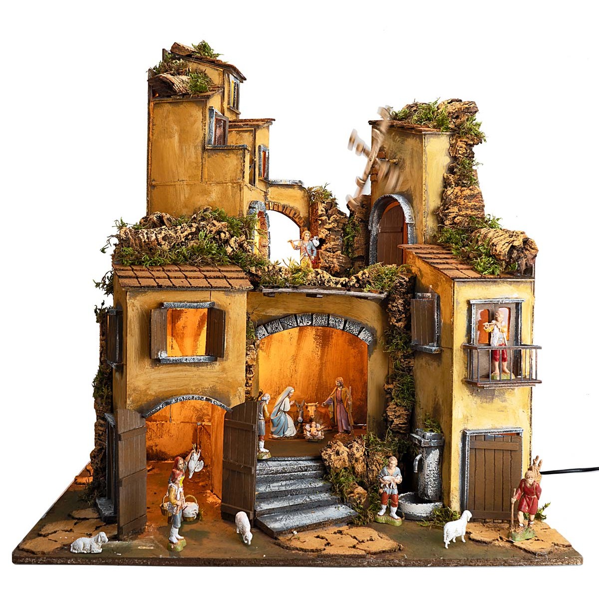 Pesebre napolitano estilo '700 iluminado con molino de viento equipado con aspas de madera giratorias funcionando con corriente, completo de estatuas de la serie Landi Moranduzzo de 10 cm.
