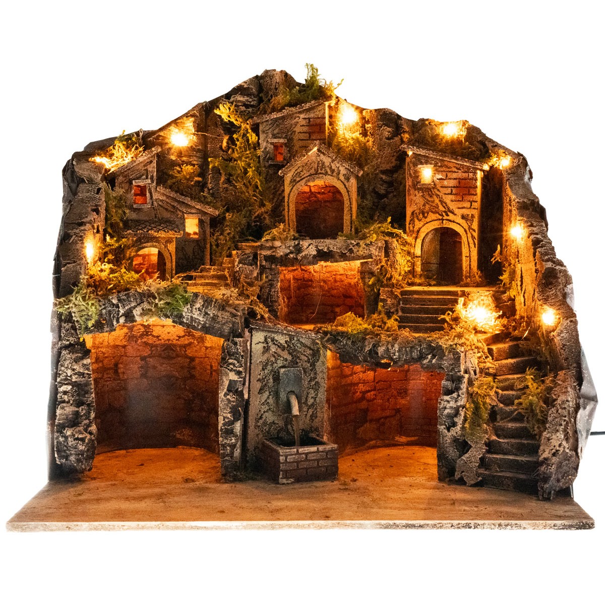 La escenografía está articulada en varios niveles excavados en la roca, con tres casitas rústicas conectadas por cuatro escaleras laterales y centrales. En la base se encuentran dos cuevas con paredes de falso ladrillo, ideales para albergar la Natividad y otros personajes. En posición central hay una fuente con chorro de agua continuo, insertada en una pared decorada.