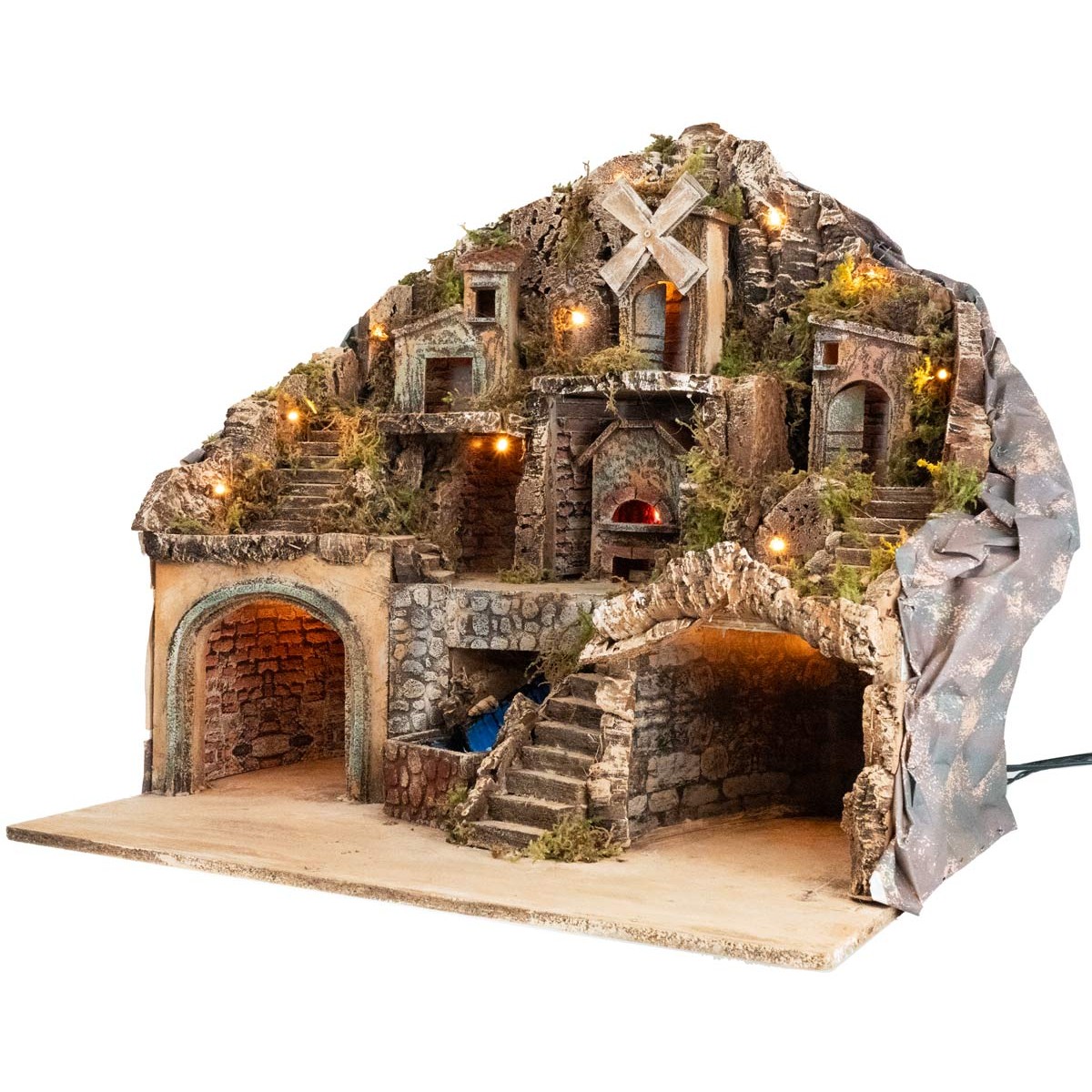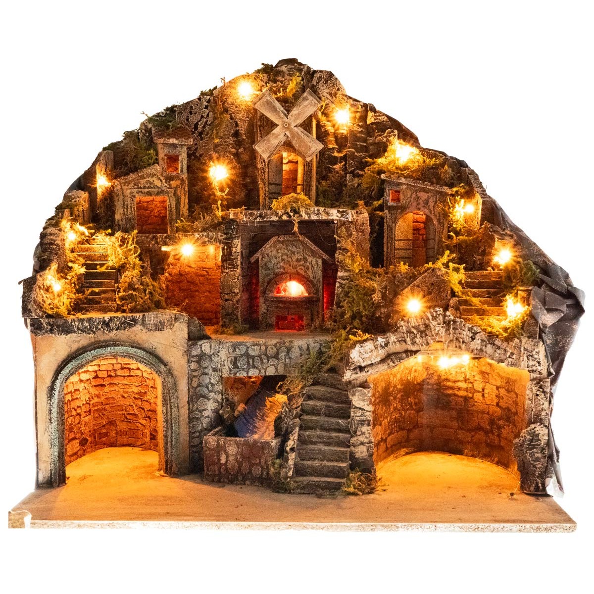 La escenografía se desarrolla en varios niveles esculpidos en la roca, con escaleras laterales y centrales que conectan las diferentes zonas. En la base hay dos cuevas con paredes de falso ladrillo, ideales para albergar la Natividad y otros personajes. En posición central fluye un arroyo esculpido en la roca, con agua que desemboca en una pequeña piscina. Encima de él se encuentra un horno iluminado con luz efecto llama.
