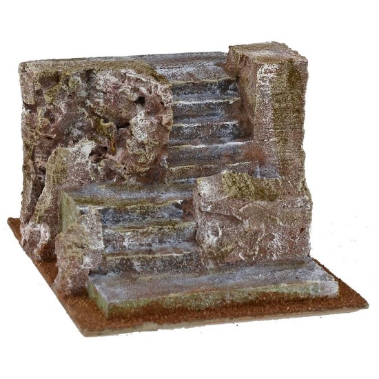 Escalera artesanal para belén con doble subida entre viejas paredes de roca. Artículo realizado en madera, corcho y musgo por hábiles artesanos italianos y recomendado para estatuas de altura 10 cm.