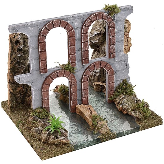 Tramo de río modular con efecto de profundidad y ruinas de acueducto de cuatro arcos, el artículo es parte de una serie que permite personalizar el curso de agua y los otros elementos están disponibles debajo de la tabla en "productos relacionados". El objeto fue producido en Italia con madera, corcho y musgo.