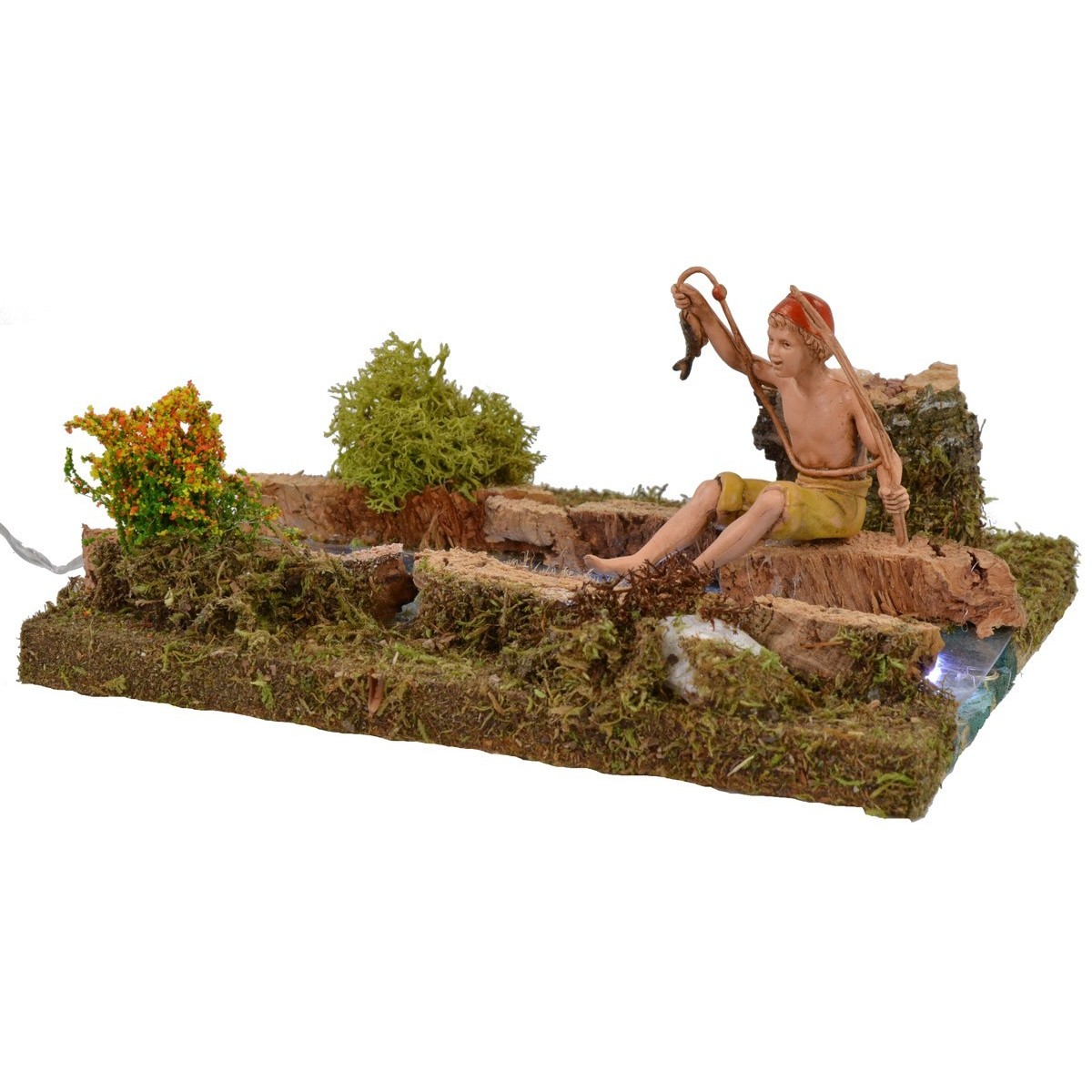 Tramo de arroyo inmerso en la vegetación con efecto de profundidad, iluminado por microleds de luz fría que funcionan con baterías. Las orillas del arroyuelo están formadas por rocas hechas de madera, sobre las cuales está sentado un pescador de la serie Landi Moranduzzo de 10 cm. El producto está realizado en madera, corcho y musgo y se recomienda para estatuas de 8-10 cm de altura.