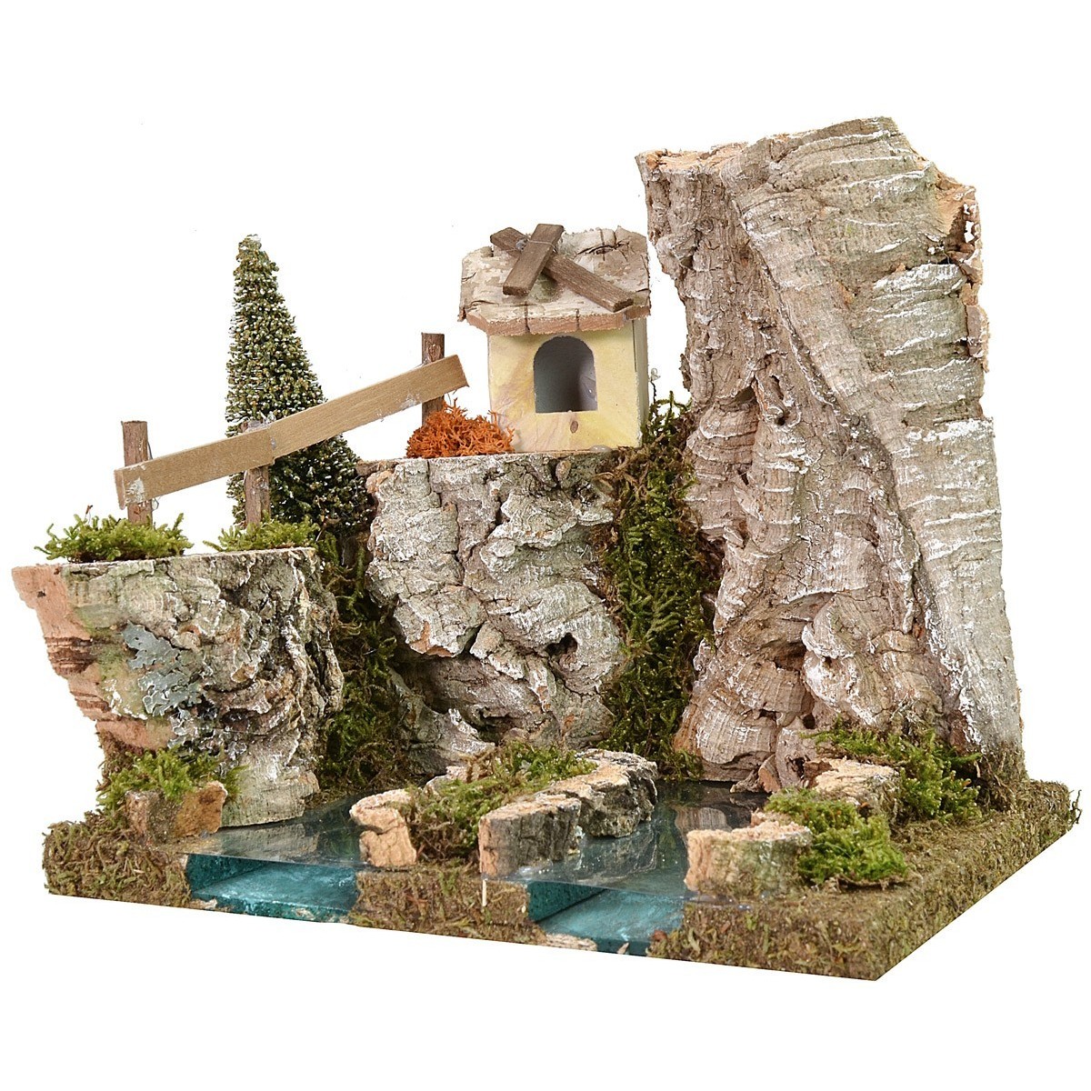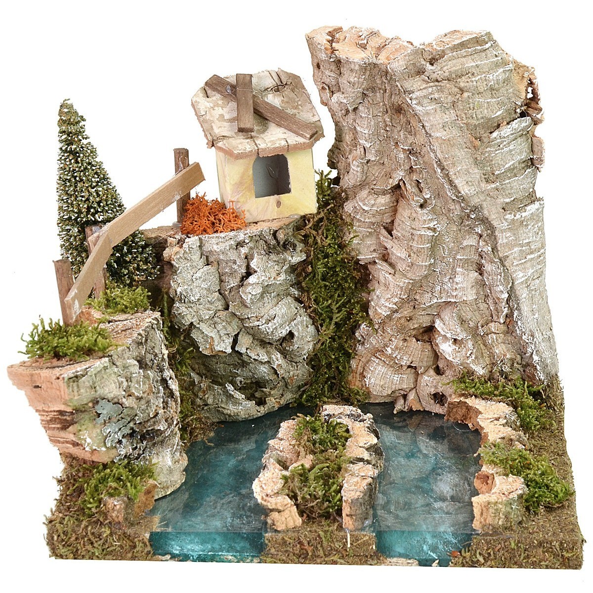 Fuente entre las rocas del río efecto profundidad para belén que forma parte de una serie componible que permite personalizar el curso de agua y las otras piezas están disponibles debajo de la tabla en los "productos relacionados". El artículo es muy original y bien acabado con árboles, una cabaña y vegetación. El objeto ha sido producido en Italia con madera, corcho y musgo.