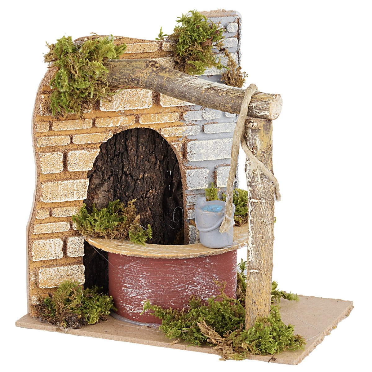 Pozo para belén en estilo clásico, producto artesanal realizado con corcho, musgo y otros materiales. En el fondo encontramos un muro de ladrillos con una puerta en el centro, mientras que en primer plano vemos un cubo atado con una cuerda. El producto está recomendado para figuritas de altura 10-12 cm. El pozo es un símbolo fundamental del belén, necesario para completar la escenografía de los ambientes exteriores del Nacimiento.