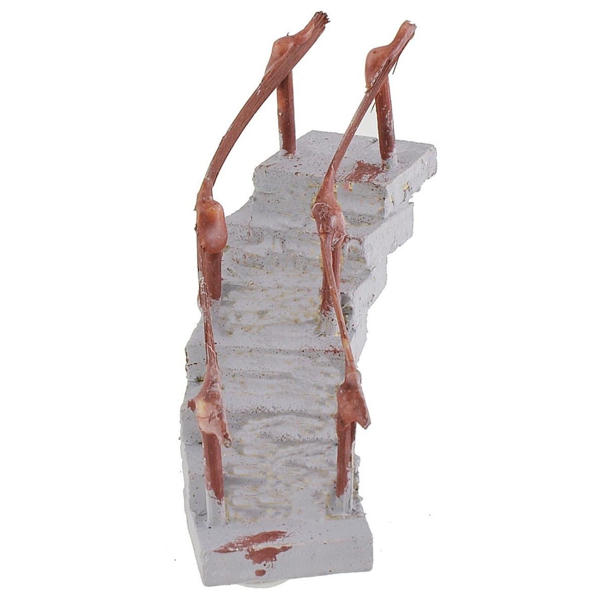 Escalera de madera con efecto cemento, curva a la derecha y completa con pasamanos, puede ser utilizada para completar escenarios y casas del belén hecho a mano. El artículo ha sido realizado artesanalmente en Italia y se recomienda para estatuas de altura de 5 a 6 cm.