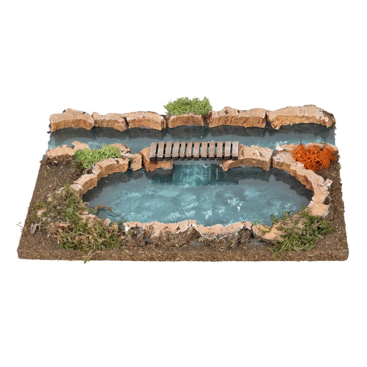 Tramo de río con efecto de profundidad, realizado artesanalmente en Italia con madera, corcho y musgo, recomendado para figuritas de altura de 5 a 8 cm. Este elemento es parte de una serie componible, permitiendo la integración con otras piezas relacionadas visibles bajo la descripción del producto. El río se caracteriza por un agua pintada para simular la profundidad, cubierta por un material transparente para un efecto realista. Los bordes están adornados con piezas de corteza de madera y un puentecillo que conecta las orillas, ofreciendo un escenario natural y preciso para tu belén.
