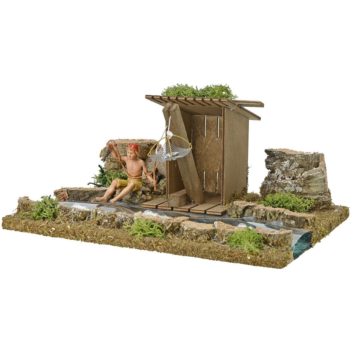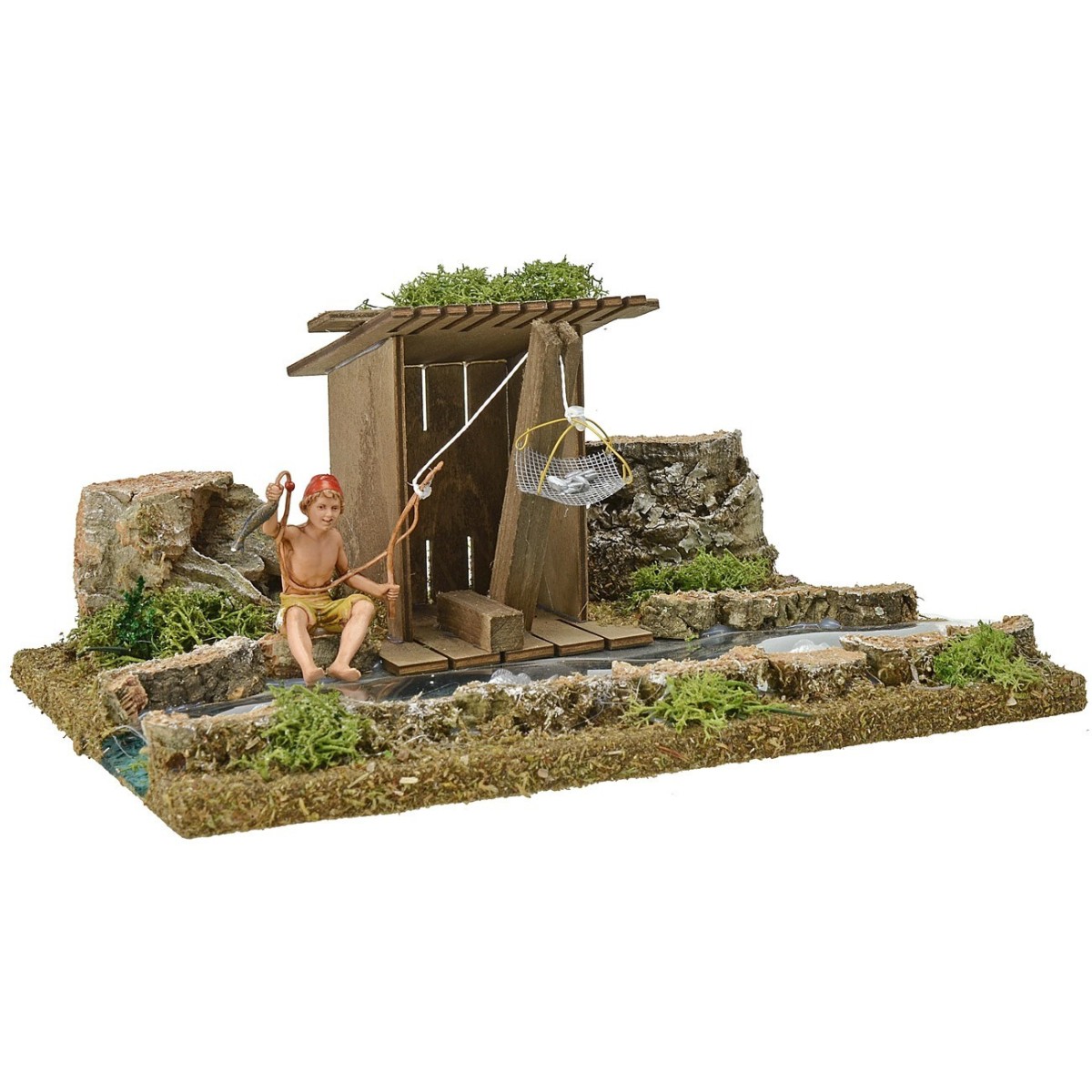 Escena de pescador con cabaña,