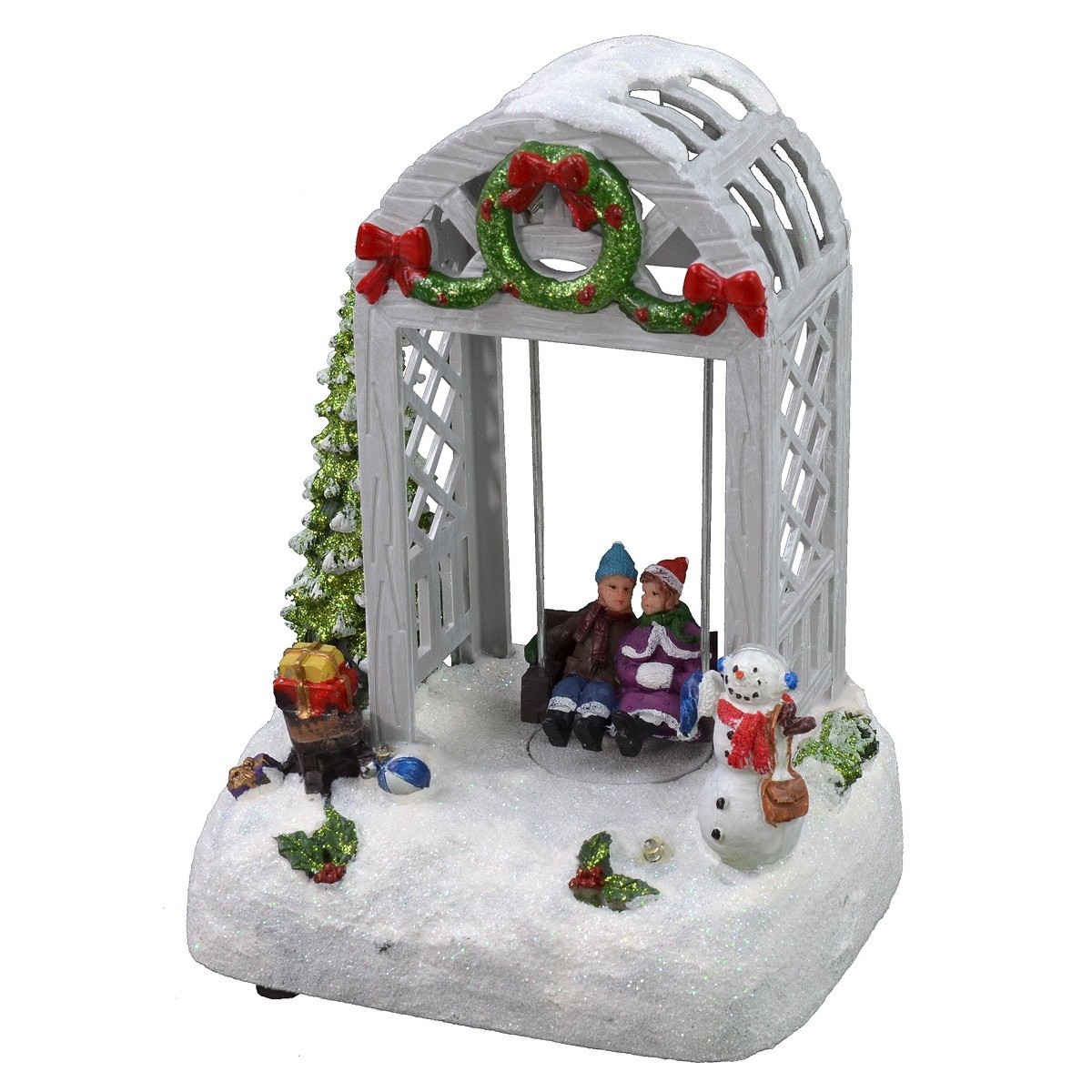 Escenografía navideña de 14x11x19 cm h que representa un gazebo blanco con decoraciones y un columpio con 2 niños, completando la escena un muñeco de nieve y un trineo. El artículo, realizado en plástico y resina, tiene dos modos de funcionamiento: se puede activar solo el movimiento que a través de un imán seguirá funcionando sin necesidad de utilizar la corriente, o también se pueden activar las luces. El producto funciona con baterías NO incluidas en la compra.