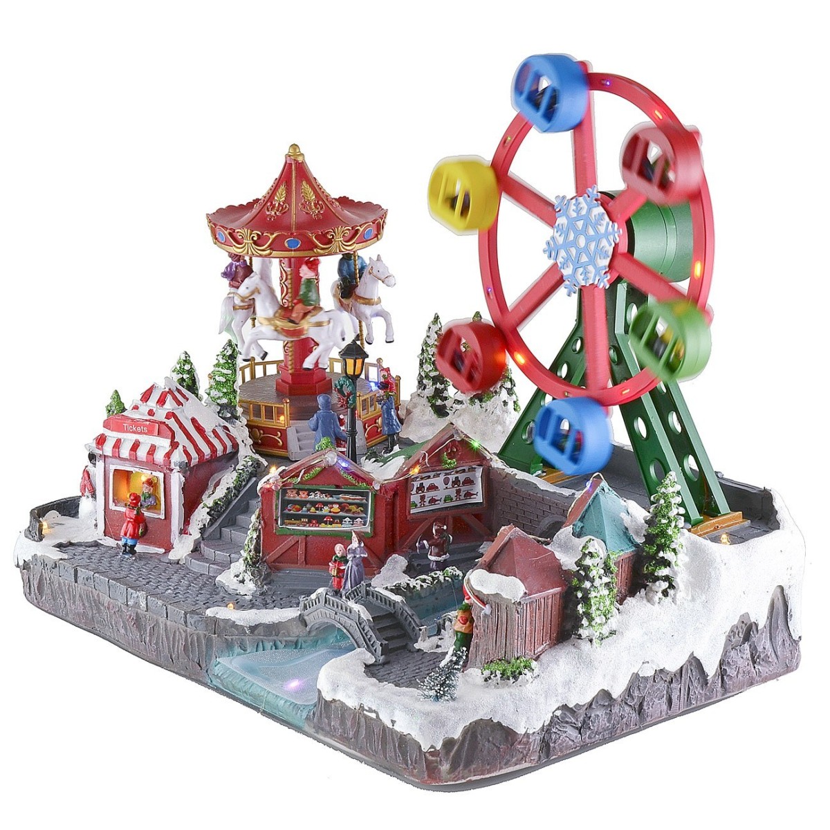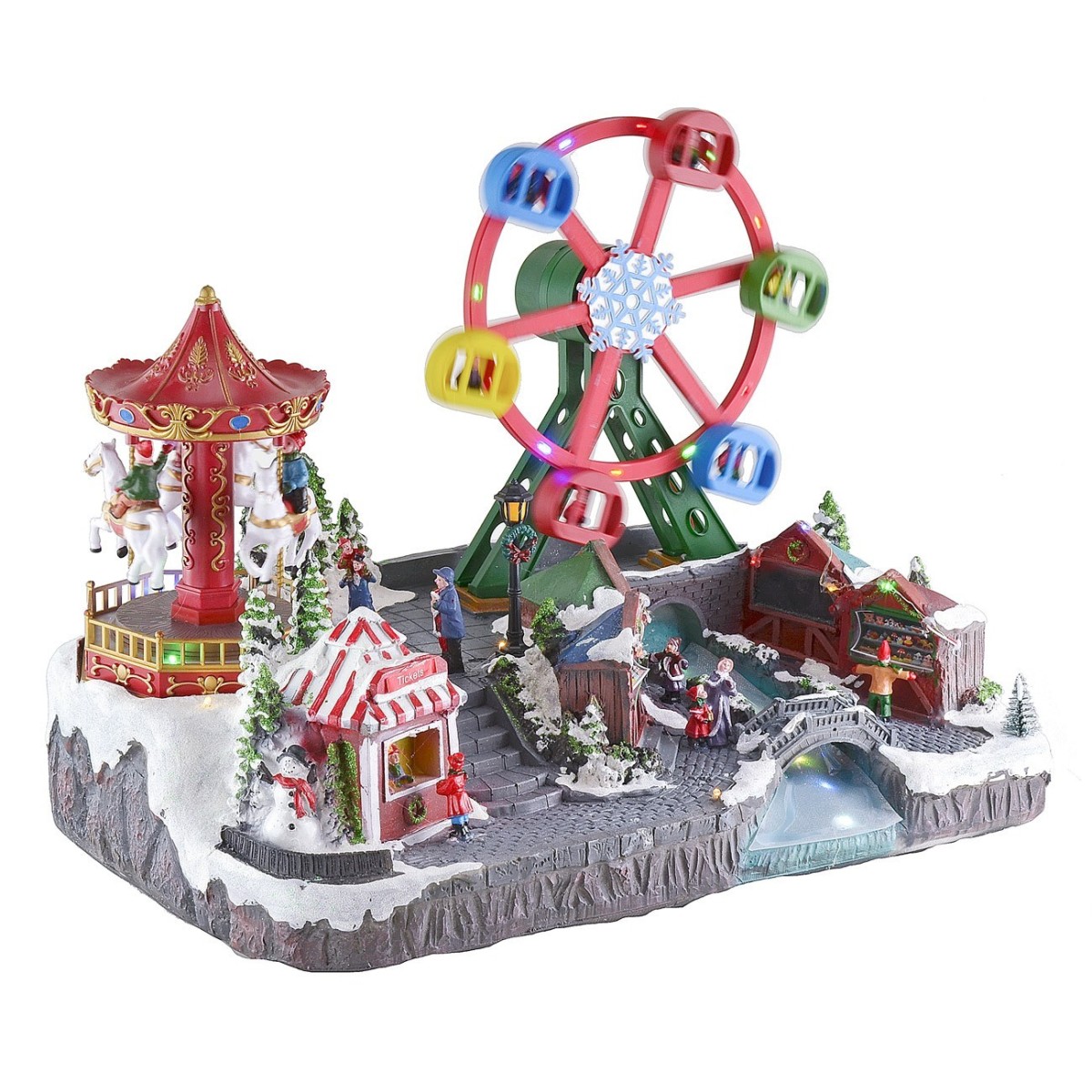 Escenografía navideña que representa un parque de atracciones con una noria, un carrusel con caballos y casitas típicas de los mercados navideños. El producto funciona con corriente eléctrica y tiene un interruptor para encender y apagar, además de estar acompañado de música navideña.