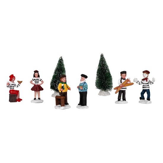 Set de 6 personajes y 2 arbolitos nevados adecuados para enriquecer escenarios navideños.