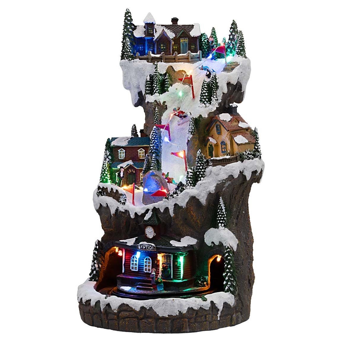 Escenografía navideña de un pueblo nevado con estación de trenes, casitas y pista de esquí, funcionante con baterías (3xAA 1,5 V, no incluidas), luces y completo de músicas navideñas. El tren gira alrededor del pueblo, añadiendo un toque de magia a la ambientación.