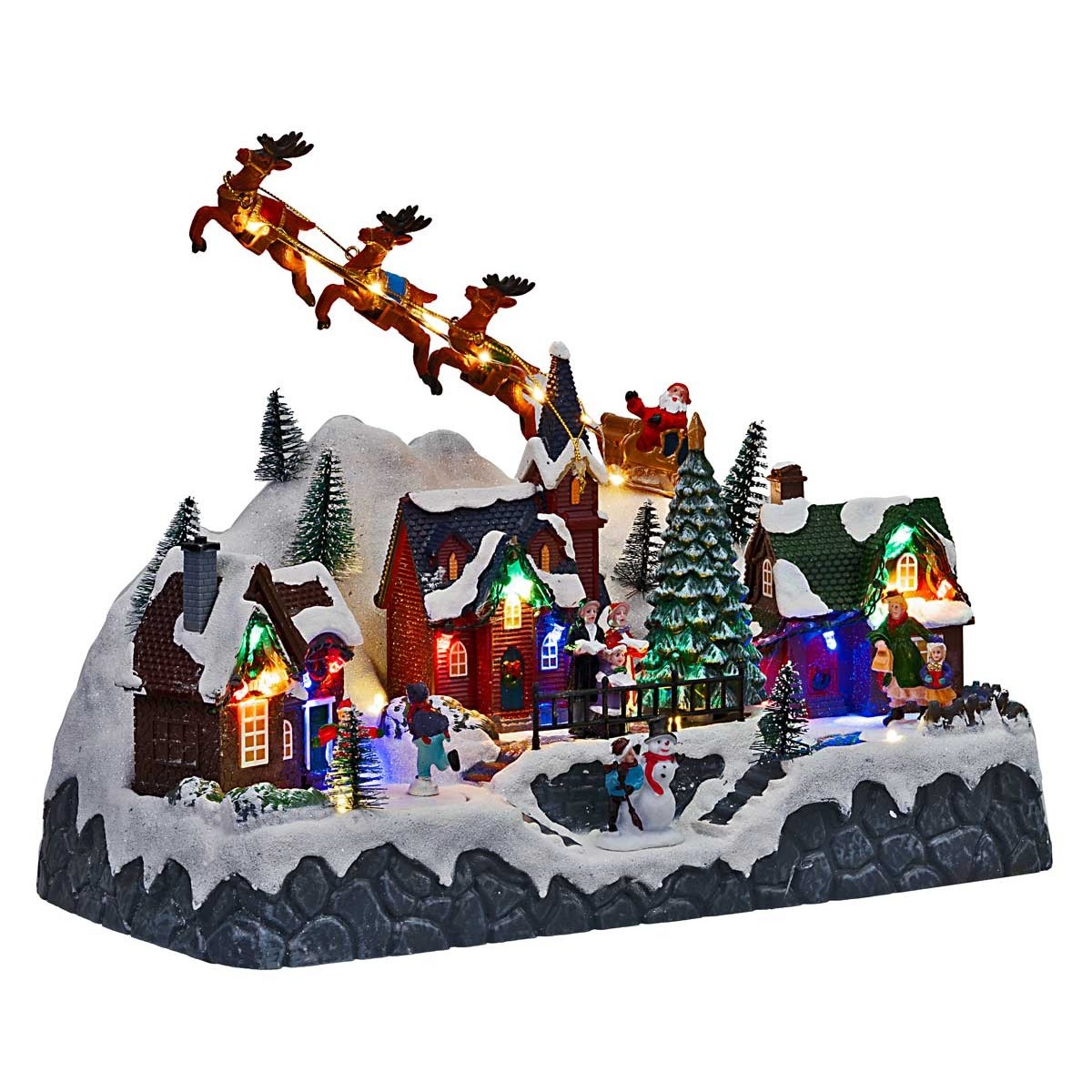 Escenografía navideña de un pueblo nevado con casitas, Papá Noel en el trineo tirado por renos y figuritas, funcionando con pilas (3xAA 1,5 V, no incluidas), luces y completo de música navideña.