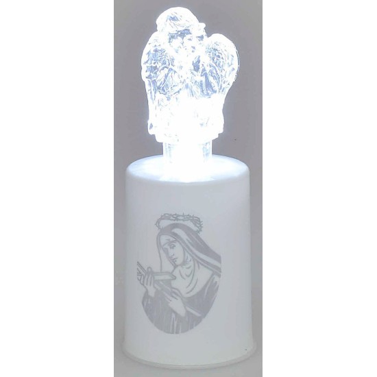Vela votiva con ángel iluminado por un led de luz fría parpadeante, funciona con baterías (incluidas y reemplazables) con una duración estimada de 90 días. Una etiqueta con la imagen de Santa Rita completa el producto.