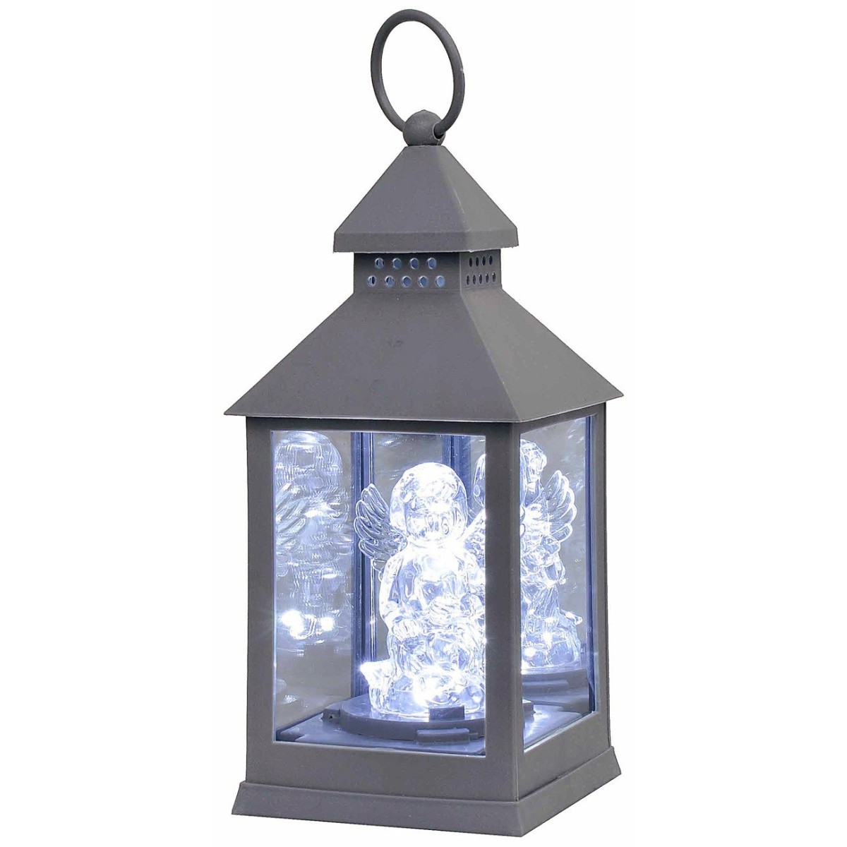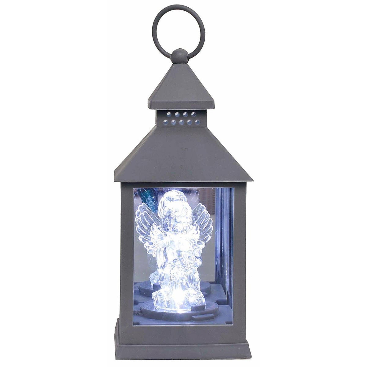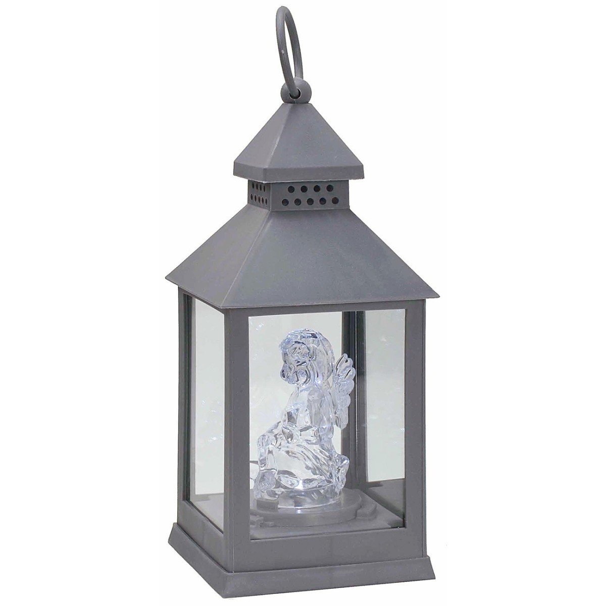 Lámpara de color gris con ángel arrodillado iluminado con luz LED fría fija, funciona con baterías (incluidas y reemplazables) con una duración estimada de 90 días. Dentro de la linterna un espejo refleja las alas del ángel.