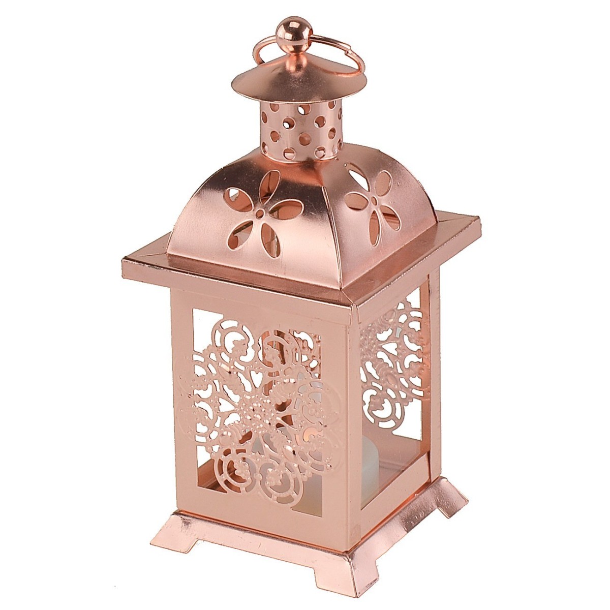 Linterna de metal color cobre con dos lados decorados con serigrafía además de las flores impresas en la cúpula, está completa con una vela con llama iluminada por una luz parpadeante. Este complemento decorativo iluminado aporta calidez al ambiente y es adecuado para colocarse en cualquier espacio ya que funciona con baterías (incluidas y reemplazables CR2032X1).