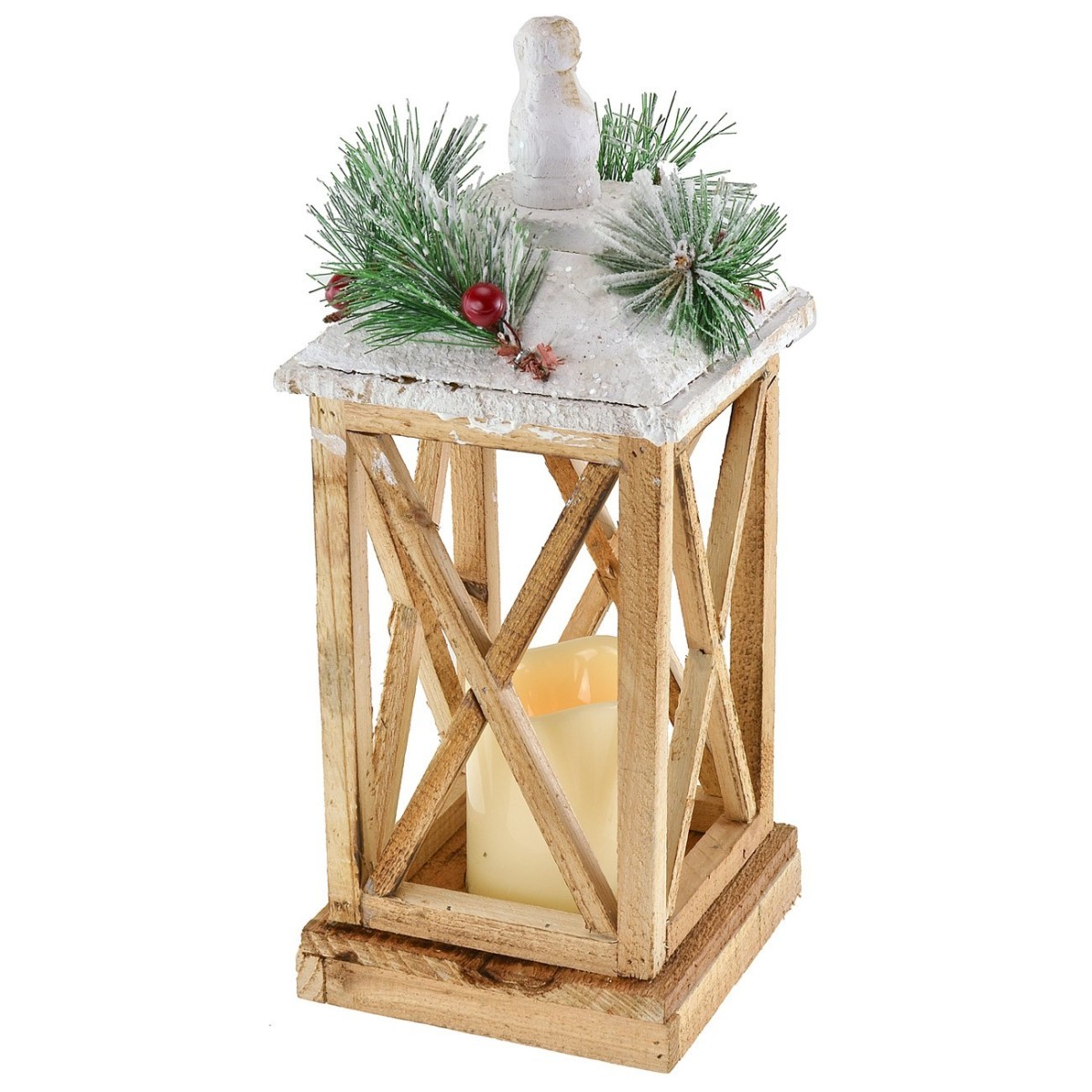 Linterna de madera clara con techo nevado decorado con agujas de pino y bayas rojas, está completa con una vela iluminada por una luz parpadeante. Este complemento decorativo aporta calidez al ambiente y es adecuado para colocarse en cualquier espacio ya que funciona con baterías (no incluidas 2xAA).