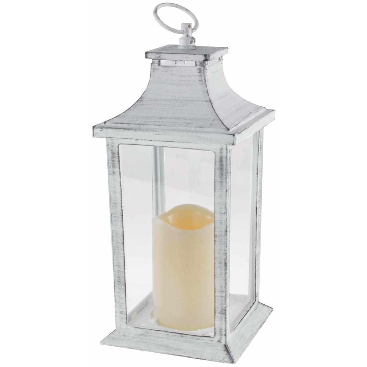 Linterna blanca envejecida completa con vela blanca de luz parpadeante. Este complemento decorativo iluminado aporta calidez al ambiente y es adecuado para ser colocado en cualquier espacio ya que funciona con baterías (no incluidas 3xAAA).