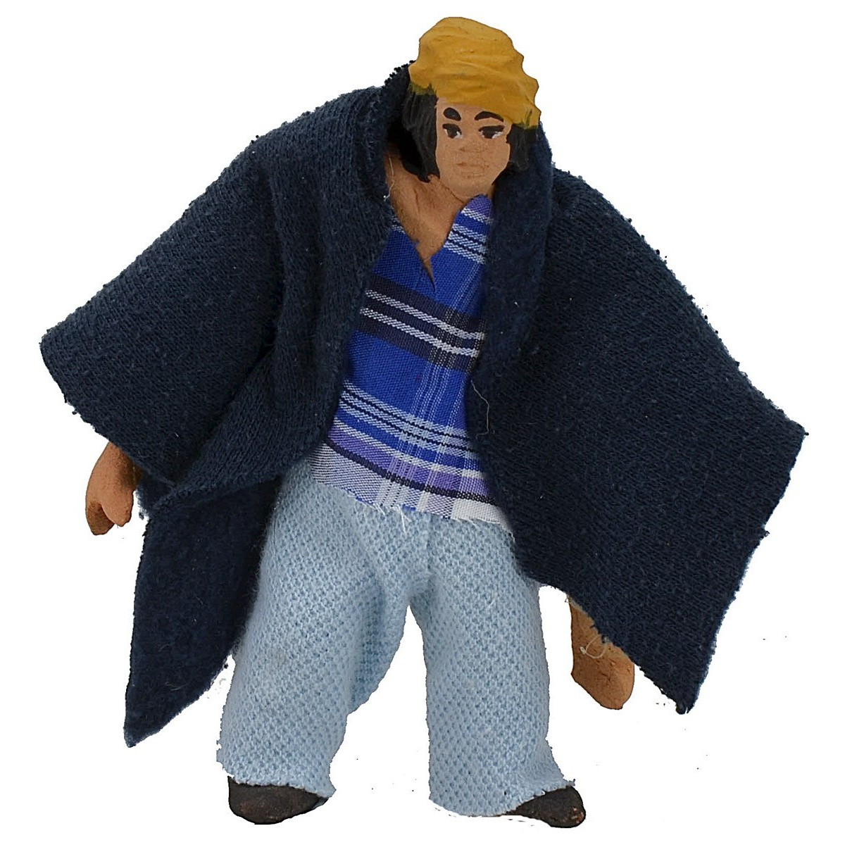 Uomo in terracotta snodato serie 10 cm vestito con abiti in tessuto. La statua è nella posizione in piedi con il busto e le braccia snodate, risulta ideale per la realizzazione di movimenti per il presepe fai da te o  per essere utilizzata fissa e riposta nella posizione desiderata. L'articolo è realizzato completamente a mano, pertanto, potrebbero variare i colori rispetto alla foto.