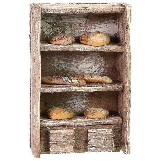 Scaffale realizzato in legno con pane, consigliato per statue di altezza cm 10, ideale per la realizzazione di botteghe o ambientazioni casalinghe.