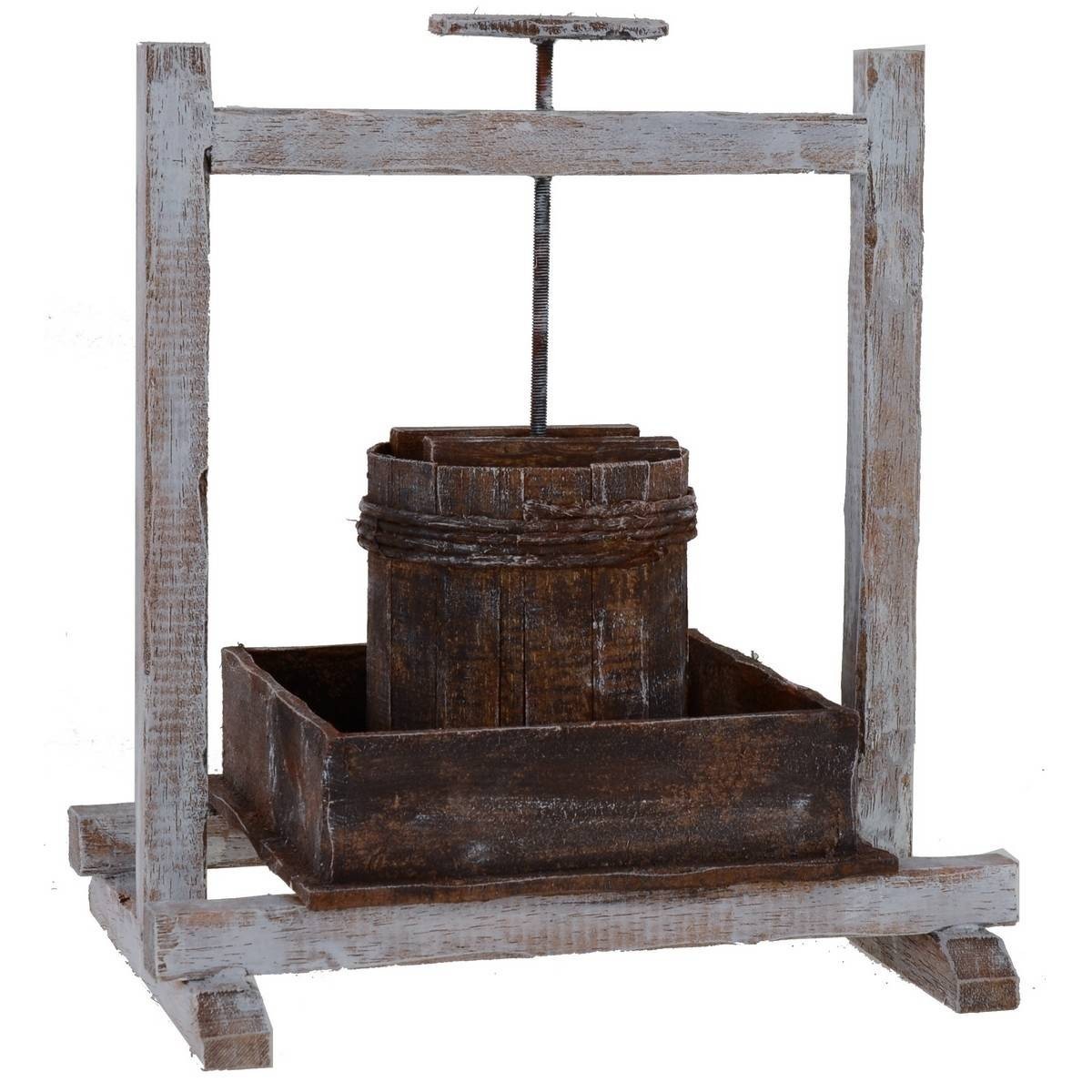 Torchio per Presepe adatto a statue di altezza cm 30. Pregevole manifattura con struttura in legno chiaro che supporta l'architrave dove s'innesta la lunga vite d'acciaio che termina nella gabbia del torchio accuratamente rifinita con le doghe di legno, attorno al grande cilindro una vasca quadrata di legno per la raccolta della spremitura. Questa articolo è stato realizzato da sapienti artigiani italiani per il Presepe classico popolare in legno.