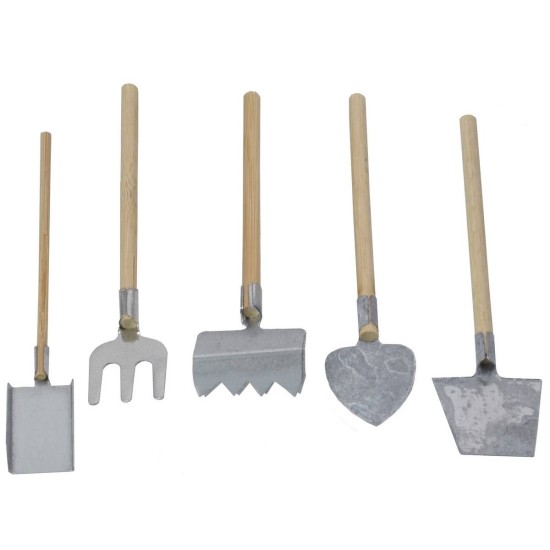 Set 5 attrezzi da campagna in legno e metallo: badile, pala, rastrello, forca e vanga.
