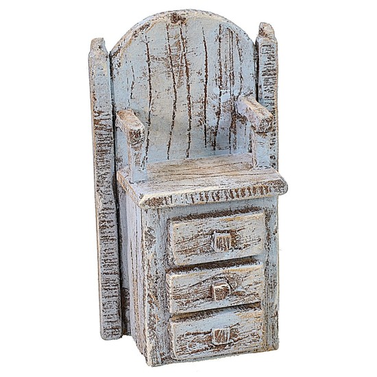 Sedia realizzata artigianalmente in legno con braccioli e 3 cassetti, consigliata per statue di altezza 10 cm.